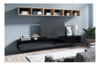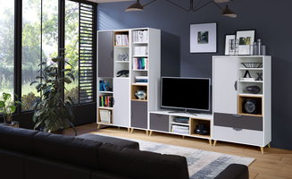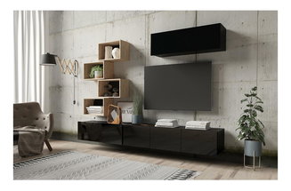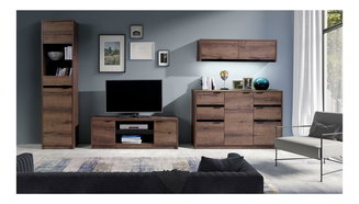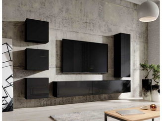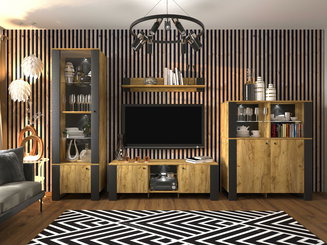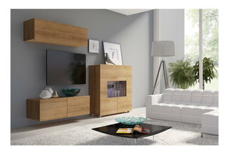 Obývací stěna se skládá z několika samostatně stojících prvků nebo jsou jednotlivé kusy nábytku k sobě přimontovány. Obvykle jsou to TV stolky, vitríny, poličky a menší skříňky. Minimalistický styl představuje sestava stolku pod televizor s vyššími nožičkami, jedna polička a maximálně dva závěsné úzké regály nebo vitríny. Pokud potřebujete více úložného prostoru, vybírejte z nabídky luxusních obývacích stěn z masivního dřeva. Oblíbená je také kombinace dřevěného korpusu a dvířek v lesklém finiši.