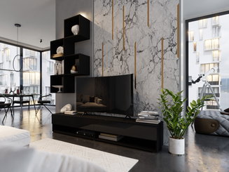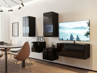 Obývací stěna se skládá z několika samostatně stojících prvků nebo jsou jednotlivé kusy nábytku k sobě přimontovány. Obvykle jsou to TV stolky, vitríny, poličky a menší skříňky. Minimalistický styl představuje sestava stolku pod televizor s vyššími nožičkami, jedna polička a maximálně dva závěsné úzké regály nebo vitríny. Pokud potřebujete více úložného prostoru, vybírejte z nabídky luxusních obývacích stěn z masivního dřeva. Oblíbená je také kombinace dřevěného korpusu a dvířek v lesklém finiši.