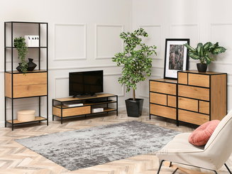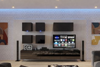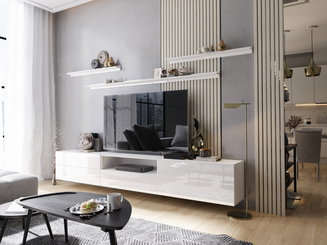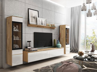 Obývací stěna se skládá z několika samostatně stojících prvků nebo jsou jednotlivé kusy nábytku k sobě přimontovány. Obvykle jsou to TV stolky, vitríny, poličky a menší skříňky. Minimalistický styl představuje sestava stolku pod televizor s vyššími nožičkami, jedna polička a maximálně dva závěsné úzké regály nebo vitríny. Pokud potřebujete více úložného prostoru, vybírejte z nabídky luxusních obývacích stěn z masivního dřeva. Oblíbená je také kombinace dřevěného korpusu a dvířek v lesklém finiši.