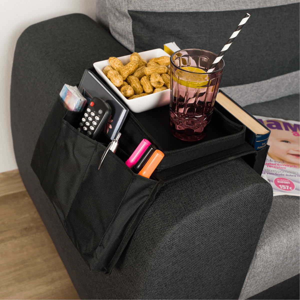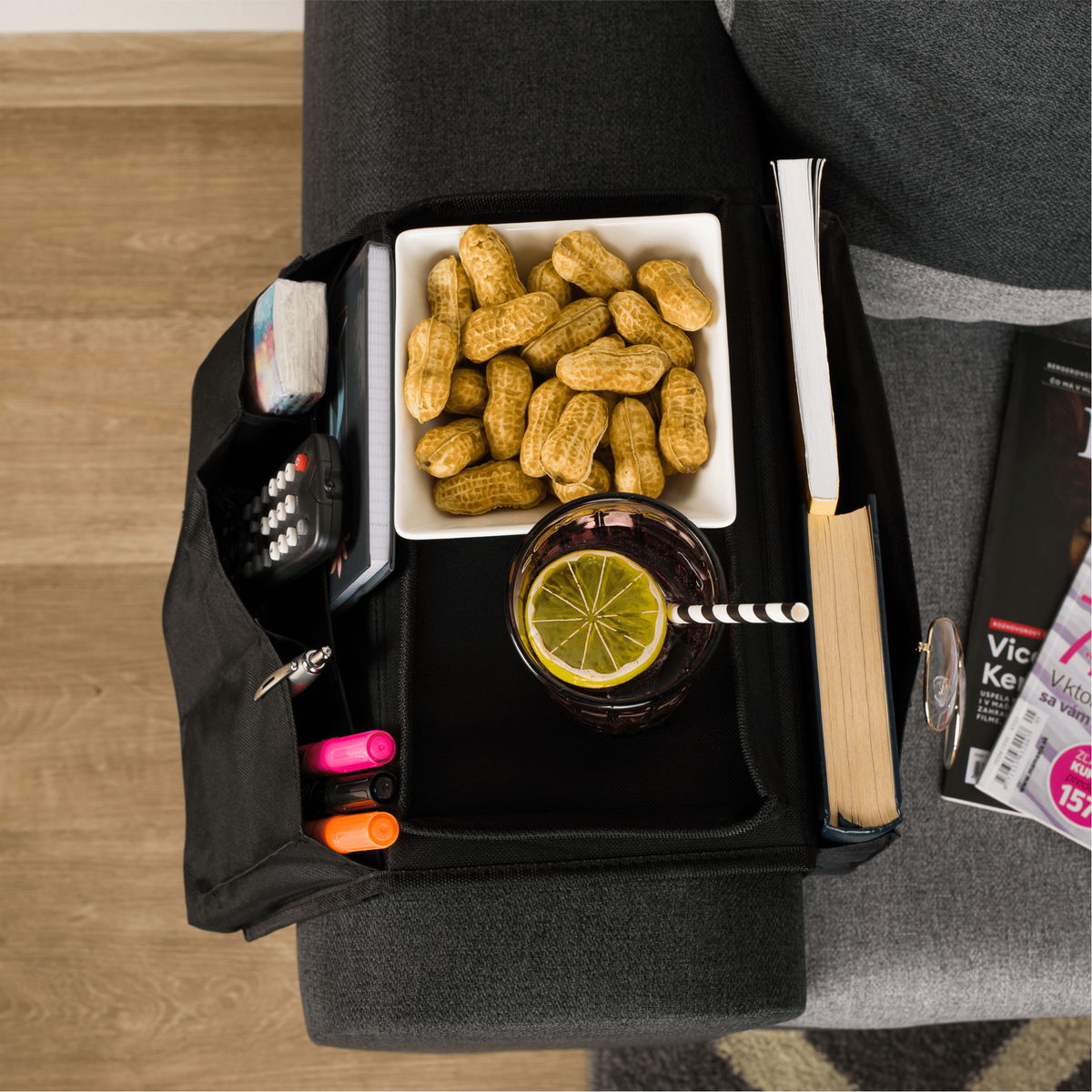 Odkládací podložka na sedačku Irena (černá) je praktický pomocník pro každého, kdo si chce usnadnit organizaci prostoru v autě nebo doma. Tato jednoduchá skládací podložka se hodí pro opěrky rukou o šířce 18 cm a je vyrobena z polyesteru. S vrchní odkládací plochou šířky 18,5 cm a výškou 4 cm poskytuje dostatek místa pro uložení různých předmětů. Kromě velké kapsy je k dispozici také tři menší přihrádky pro další drobnosti. Podložka má nosnost až 5 kg a je dodávána v demontu. S touto podložkou budete mít vždy vše po ruce a zařízení vašeho prostoru bude snadné.