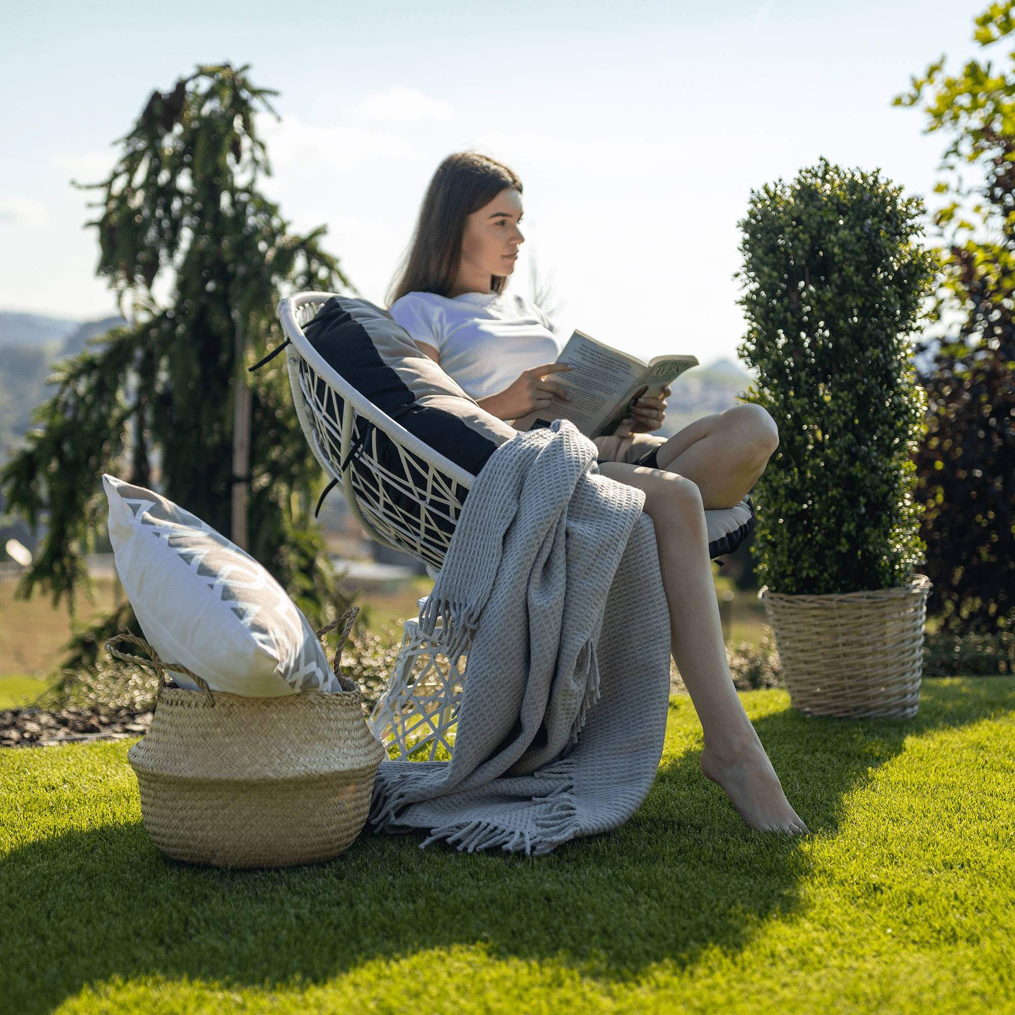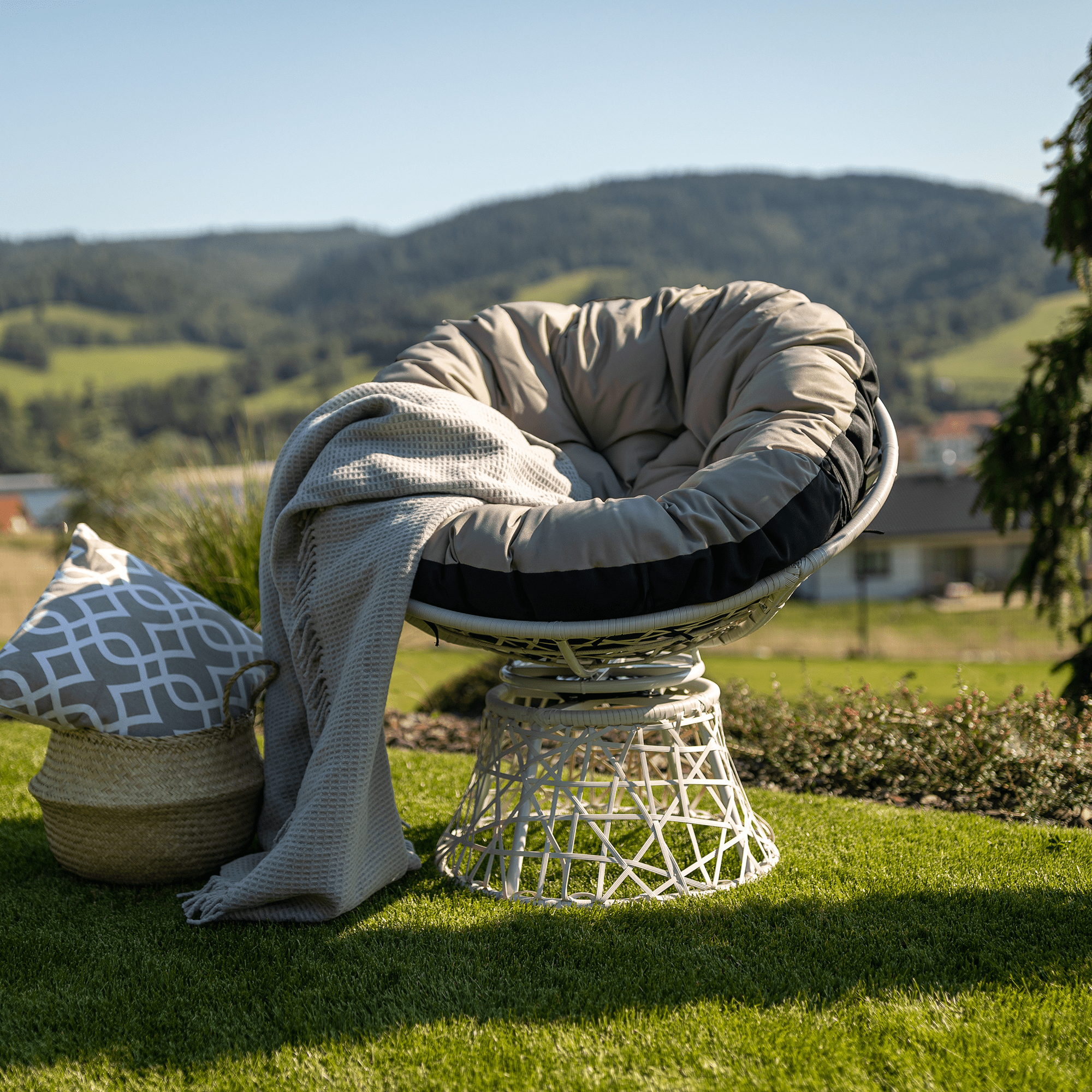 Pohodlné a stylové. Takové je otočné křeslo Frage BIG. Své místo si najde v interiéru, ale i exteriéru. Vynikne na terase či balkoně. Oceníte i jeho vodeoodolný polštář.
