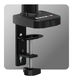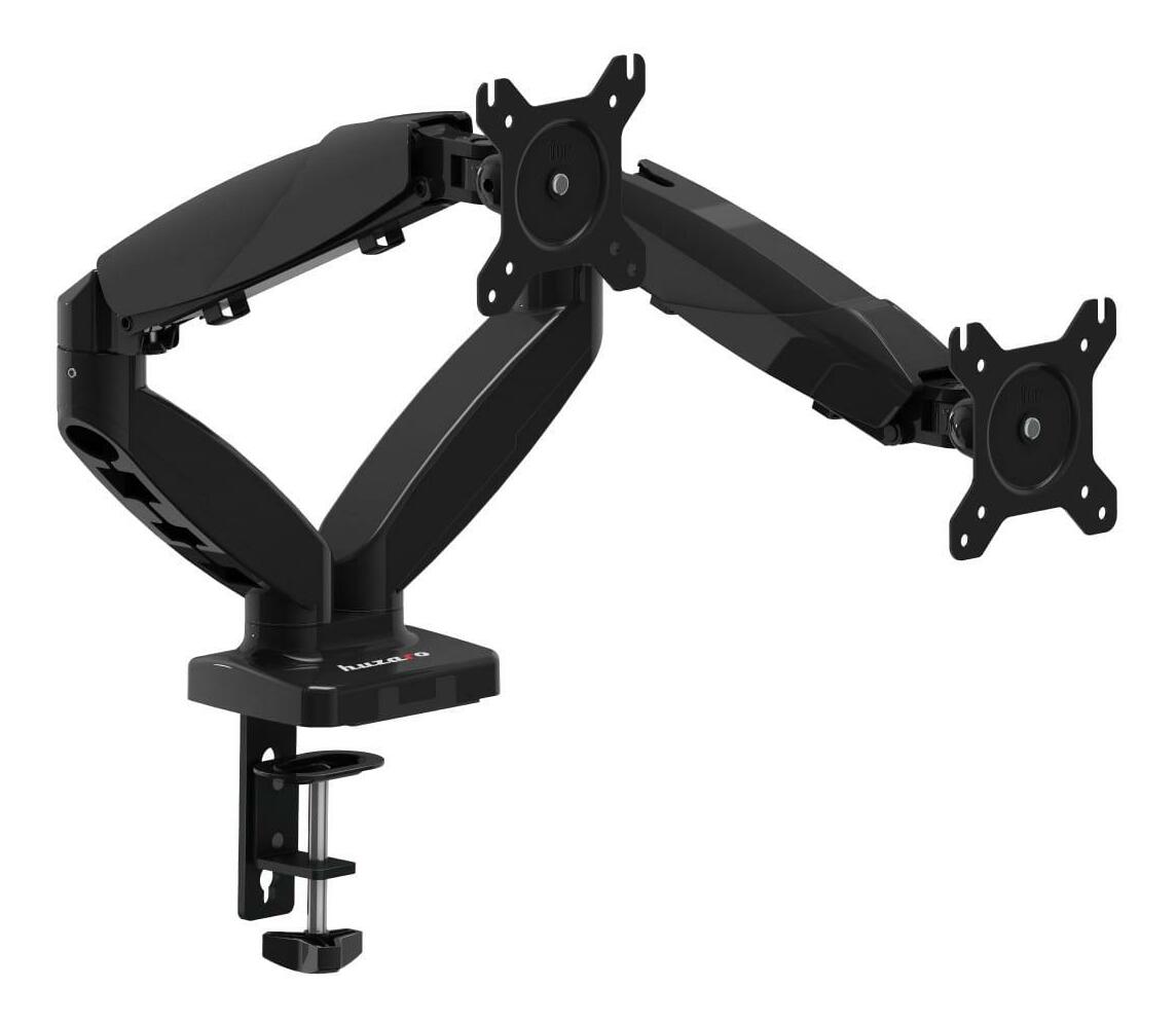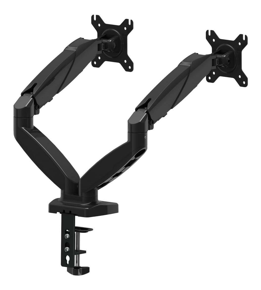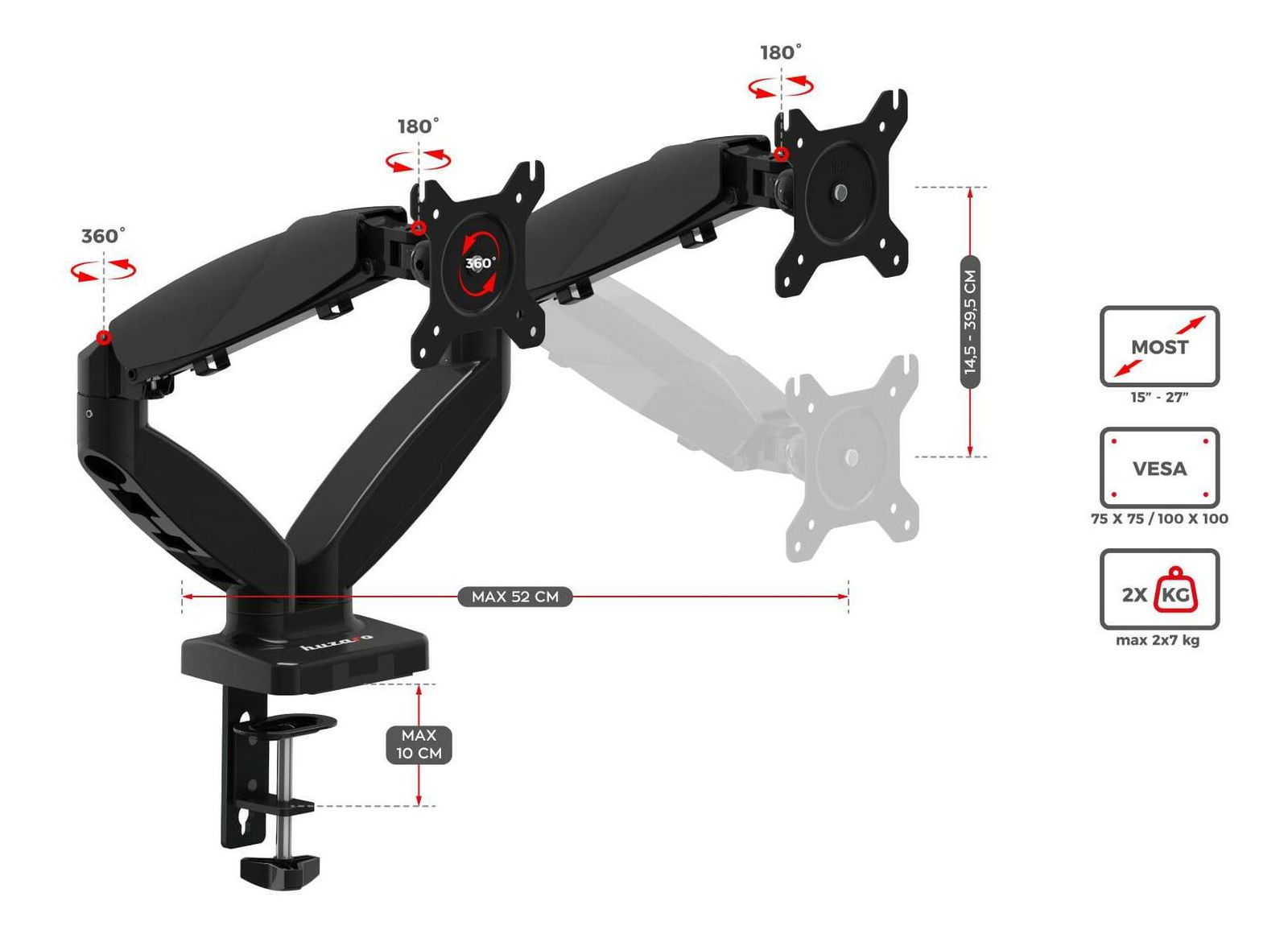 Držák na dva monitory řeší problém nepohodlného sezení a usnadňuje organizaci pracovní stanice s více obrazovkami. Vertikálním a horizontálním nastavením obou ramen si můžete nastavit vybavení podle svých preferencí a v případě potřeby jednoduše změnit jejich polohu. Plynová pružina a víceúrovňové nastavení umožňují jedním pohybem přesunout každý monitor do jiné polohy. Možnost přiblížení/oddálení monitorů, nastavení nahoru/dolů a vertikálního a horizontálního otáčení . Nejen, že je každá obrazovka plně nastavitelná sama o sobě, ale můžete také volně umístit oba monitory vůči sobě. O 360° pohyblivé hlavy s funkcí PIVOT poskytují téměř neomezené možnosti. Díky speciálním hlavám lze nastavit také úhly monitorů. Držák umožňuje nejen měnit jejich polohu, ale také úhel, pod kterým jsou naše displeje nastaveny. Každé rameno rukojeti bezpečně udrží až 7 kg. Držák je kompatibilní s běžným tržním montážním standardem pro monitory s roztečí otvorů 100 mm x 100 mm a 75 mm x 75 mm. Skrytý systém správy kabelů zlepšuje estetiku celé herní stanice a chrání kabely před náhodným poškozením. Díky univerzálnímu stabilnímu montážnímu mechanismu je připevnění držáku k desce mimořádně jednoduché a celá konstrukce je pevně spojena s pracovním stolem. Různé polohy otvorů vám umožňují nastavit výšku instalace podle vašich preferencí. Držák je vhodný pro desky o tloušťce do 10 cm.