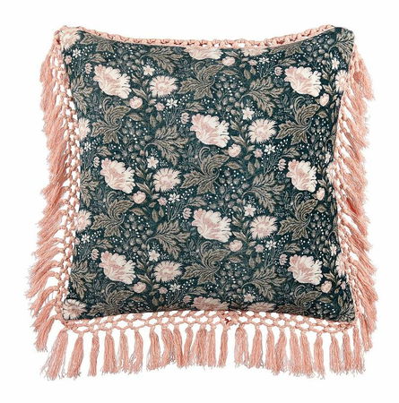Zkrášlete si pohovku nebo postel tímto nádherným polštářem. Jemný květovaný vzor v odstínech růžové a modré doplňují ozdobné třásně po celém obvodu. Polštář lze použít samostatně nebo v kombinaci s jinými textilními dekoracemi.