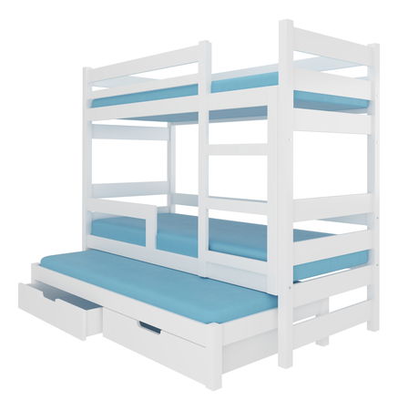Postel KARIN je patrová postel, která přináší do dětského pokoje šarm a praktické využití prostoru. Je vyrobena z kvalitního borovicového dřeva, přičemž střed postele a čela šuplíků jsou z MDF desky, což poskytuje spojení pevnosti a elegance. KARIN je vybavena roštem vyrobeným z pružných lamel, které zajišťují správnou podporu a pohodlí pro vaše dítě. S pěnovou matrací s odnímatelným povlakem na zip bude mít váš malý zlatíčko dokonalý spánek plný snů a odpočinku. Tato postel nabízí třetí výsuvné lůžko, což znamená, že máte možnost přidat další místo ke spaní, když to bude nutné. Bariéra proti spadnutí zajišťuje bezpečnost na horním lůžku, aby vaše dítě mělo klidný a bezstarostný spánek. KARIN také disponuje úložným prostorem ve formě dvou vysouvacích zásuvek na pryžových kolečkách. Tyto zásuvky jsou ideální pro uskladnění oblečení, hraček a dalších věcí, což pomáhá udržovat pokoj vašeho dítěte čistý a uklizený. S plochou na spaní 180 x 75 cm pro horní lůžko a 172 x 75 cm pro spodní výsuvné lůžko, KARIN poskytuje dostatek místa pro pohodlný spánek a relaxaci. Vaše děti budou mít vlastní prostor, kde si mohou užívat svá dobrodružství, hry a příjemné chvíle.
