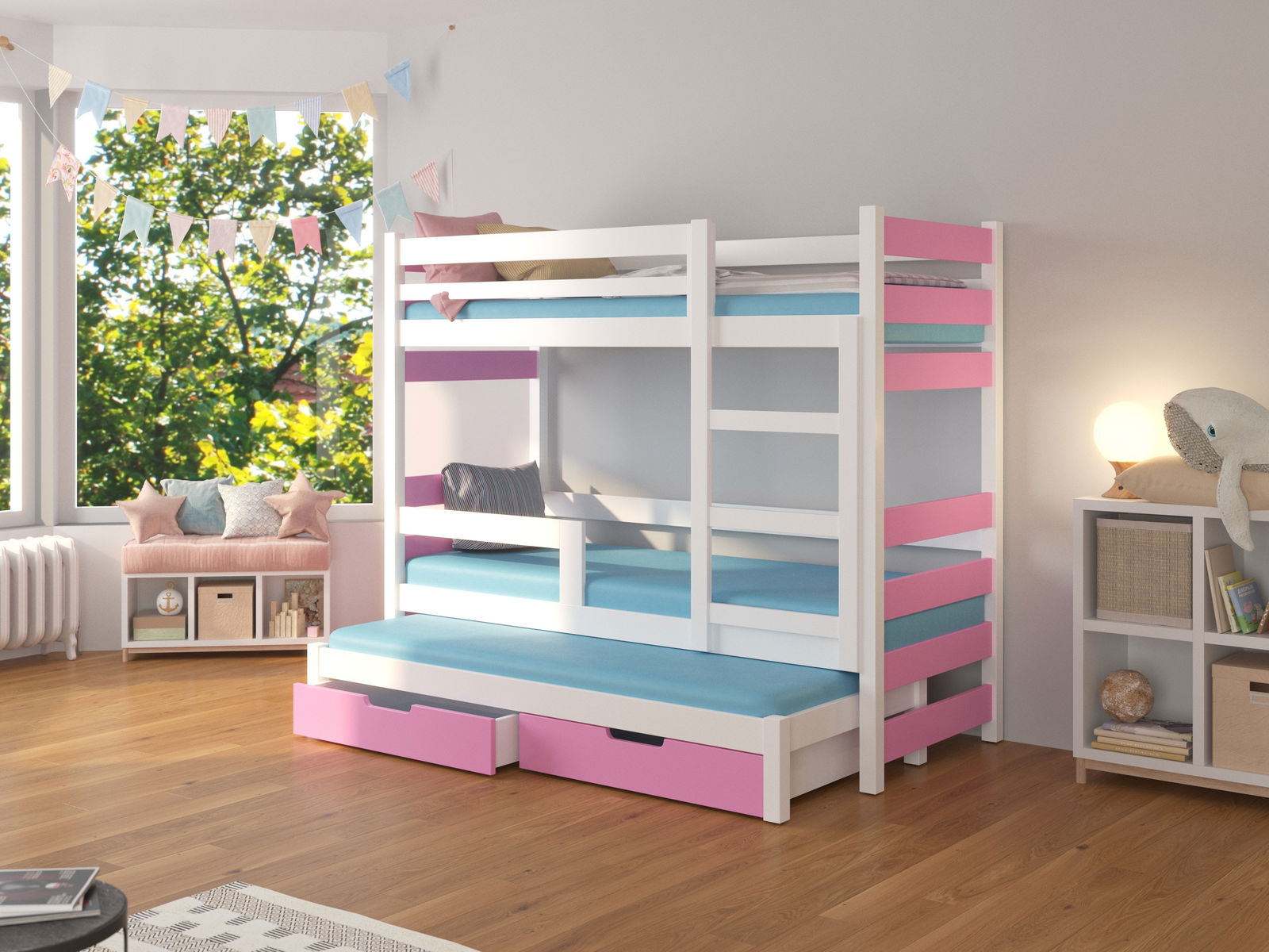 horní lůžka: 180 x 75 cm, spodní výsuvné lůžko: 172 x 75 cm