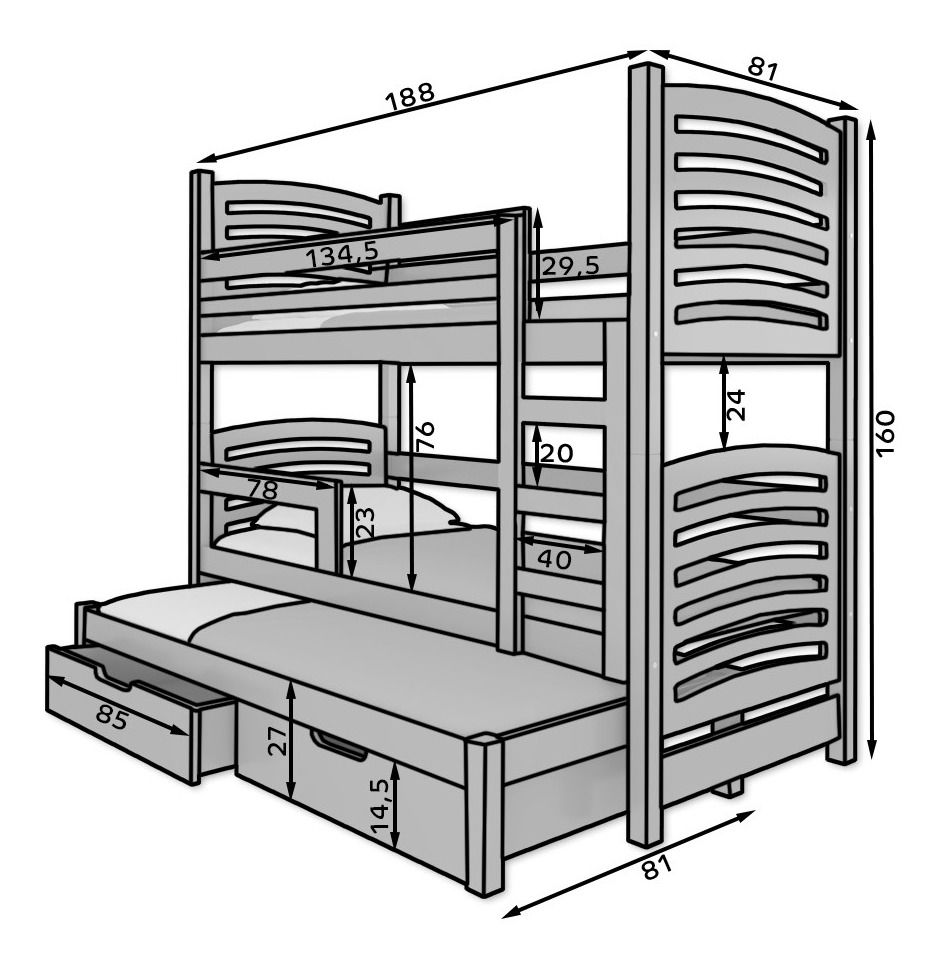 horní lůžka: 180 x 75 cm, spodní výsuvné lůžko: 172 x 75 cm