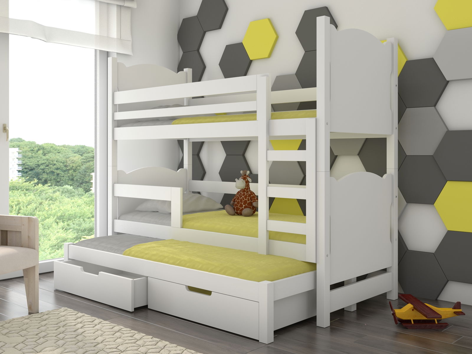 Tato patrová postýlka je víc než jen kousek nábytku – je to místo, kde se sní sny a vytvářejí se nekonečné vzpomínky. LUKRECE je vyrobena z kvalitního borovicového dřeva s okouzlujícími zaoblenými hranami. Její přírodní materiál dodává postýlce přirozenou krásu a teplo. Střed postele a čela zásuvek jsou vyrobeny z MDF desky, což zaručuje pevnost a trvanlivost. Tato kombinace materiálů dodává postýlce LUKRECIE stylový a moderní vzhled. Spánek v LUKRECCI je kouzelným zážitkem. Je vybavena roštem vyrobeným z pružných lamel, který poskytuje optimální podporu a pohodlí. S pěnovou matrací opatřenou odnímatelným povlakem na zip je čištění a udržování matrace jednoduché a praktické. Vaše dítě bude mít sladké sny a obnovující spánek, připravené čelit novým dobrodružstvím každé ráno. LUKRECE také nabízí dostatek úložného prostoru. Se dvěma vysouvacími šuplíky na gumových kolečkách budou mít vaše děti dostatek místa pro uložení svých hraček, knih a všech důležitých věcí. S postýlkou LUKRECIE je pokoj vždy uklizený a organizovaný, což umožňuje vašim dětem svobodně si užívat svůj prostor. Plocha na spaní v LUKRECCI je úžasná. Horní lůžko má rozměr 180 x 75 cm, zatímco spodní výsuvné lůžko má rozměr 172 x 75 cm. To znamená, že vaše děti budou mít dostatek místa pro pohodlný spánek a zároveň si budou moci užívat svoji vlastní soukromou zónu. S bariérou proti spadnutí můžete mít jistotu, že vaše děti budou bezpečné a ochráněné během spánku.