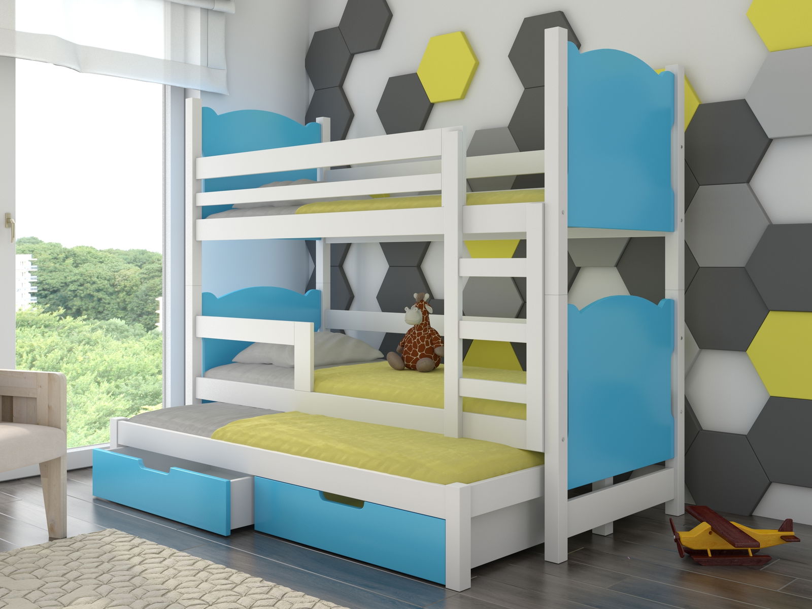 Tato patrová postýlka je víc než jen kousek nábytku – je to místo, kde se sní sny a vytvářejí se nekonečné vzpomínky. LUKRECE je vyrobena z kvalitního borovicového dřeva s okouzlujícími zaoblenými hranami. Její přírodní materiál dodává postýlce přirozenou krásu a teplo. Střed postele a čela zásuvek jsou vyrobeny z MDF desky, což zaručuje pevnost a trvanlivost. Tato kombinace materiálů dodává postýlce LUKRECIE stylový a moderní vzhled. Spánek v LUKRECCI je kouzelným zážitkem. Je vybavena roštem vyrobeným z pružných lamel, který poskytuje optimální podporu a pohodlí. S pěnovou matrací opatřenou odnímatelným povlakem na zip je čištění a udržování matrace jednoduché a praktické. Vaše dítě bude mít sladké sny a obnovující spánek, připravené čelit novým dobrodružstvím každé ráno. LUKRECE také nabízí dostatek úložného prostoru. Se dvěma vysouvacími šuplíky na gumových kolečkách budou mít vaše děti dostatek místa pro uložení svých hraček, knih a všech důležitých věcí. S postýlkou LUKRECIE je pokoj vždy uklizený a organizovaný, což umožňuje vašim dětem svobodně si užívat svůj prostor. Plocha na spaní v LUKRECCI je úžasná. Horní lůžko má rozměr 180 x 75 cm, zatímco spodní výsuvné lůžko má rozměr 172 x 75 cm. To znamená, že vaše děti budou mít dostatek místa pro pohodlný spánek a zároveň si budou moci užívat svoji vlastní soukromou zónu. S bariérou proti spadnutí můžete mít jistotu, že vaše děti budou bezpečné a ochráněné během spánku.
