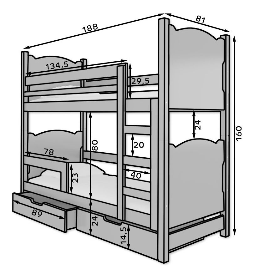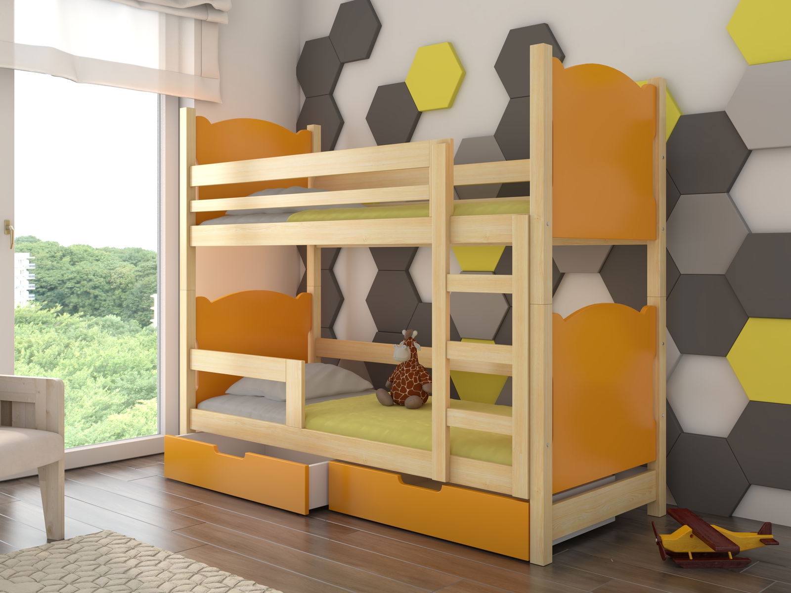 Dětská postýlka MARRYANN je jedinečným místem, kde se vaše děti budou cítit milovány, bezpečné a šťastné. S jejími elegantními oblými hranami a čely ve tvaru oušek, tato postýlka přináší do pokoje dotek hravosti a nekonečného půvabu. Postýlka Marryann je vyrobena z přírodního borového dřeva, což přináší do vašeho domova příjemnou atmosféru a teplý nádech přírody. Střed postele a čela zásuvek jsou z MDF desky, zajišťující pevnost a trvanlivost. Tento kombinovaný materiál dodává postýlce stylový vzhled, který si zaslouží obdiv. Vaše děti nebudou mít žádné problémy se spánkem, neboť postýlka Marryann je vybavena roštem z pružných lamel v systému Flex. Tento rošt poskytuje optimální podporu a přispívá ke zdravému spánku. Součástí postýlky je také pěnová matrace s odnímatelným povlakem na zip, což zajišťuje snadnou údržbu a čistotu. Chcete udržet pokoj uklizený a organizovaný? S postýlkou Marryann to není problém! Nabízí vám dvě vysouvací zásuvky na pryžových kolečkách, ve kterých můžete uložit hračky, knihy a jiné potřebné věci. Vaše děti se tak mohou soustředit na hraní a objevování nových dobrodružství. Se dvěma rozměrnými plochami na spaní – 180 x 75 cm – postýlka Marryann poskytuje dostatek místa pro dvě osoby. Tato postýlka je místem, kde si společně mohou vyprávět příběhy, dělit se o tajemství a budovat silné pouto mezi sebou. A s bariérou proti spadnutí zajišťujete bezpečný a klidný spánek vašich malých pokladů.