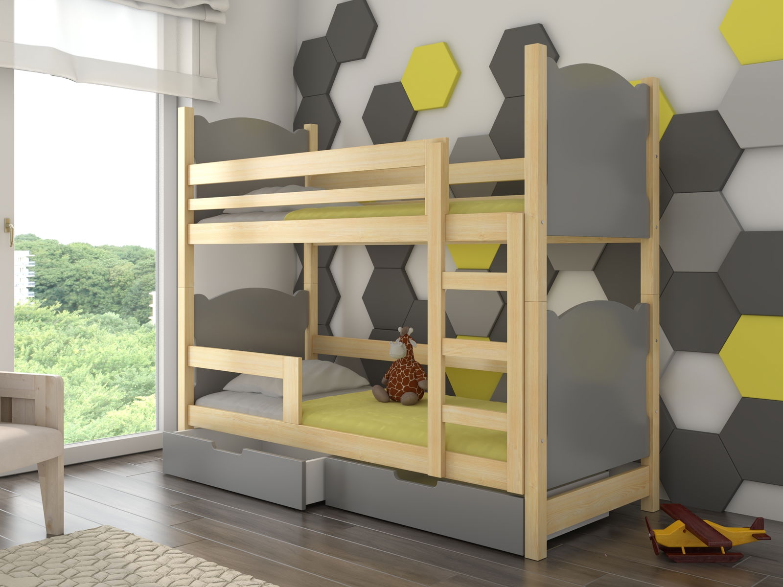 Dětská postýlka MARRYANN je jedinečným místem, kde se vaše děti budou cítit milovány, bezpečné a šťastné. S jejími elegantními oblými hranami a čely ve tvaru oušek, tato postýlka přináší do pokoje dotek hravosti a nekonečného půvabu. Postýlka Marryann je vyrobena z přírodního borového dřeva, což přináší do vašeho domova příjemnou atmosféru a teplý nádech přírody. Střed postele a čela zásuvek jsou z MDF desky, zajišťující pevnost a trvanlivost. Tento kombinovaný materiál dodává postýlce stylový vzhled, který si zaslouží obdiv. Vaše děti nebudou mít žádné problémy se spánkem, neboť postýlka Marryann je vybavena roštem z pružných lamel v systému Flex. Tento rošt poskytuje optimální podporu a přispívá ke zdravému spánku. Součástí postýlky je také pěnová matrace s odnímatelným povlakem na zip, což zajišťuje snadnou údržbu a čistotu. Chcete udržet pokoj uklizený a organizovaný? S postýlkou Marryann to není problém! Nabízí vám dvě vysouvací zásuvky na pryžových kolečkách, ve kterých můžete uložit hračky, knihy a jiné potřebné věci. Vaše děti se tak mohou soustředit na hraní a objevování nových dobrodružství. Se dvěma rozměrnými plochami na spaní – 180 x 75 cm – postýlka Marryann poskytuje dostatek místa pro dvě osoby. Tato postýlka je místem, kde si společně mohou vyprávět příběhy, dělit se o tajemství a budovat silné pouto mezi sebou. A s bariérou proti spadnutí zajišťujete bezpečný a klidný spánek vašich malých pokladů.