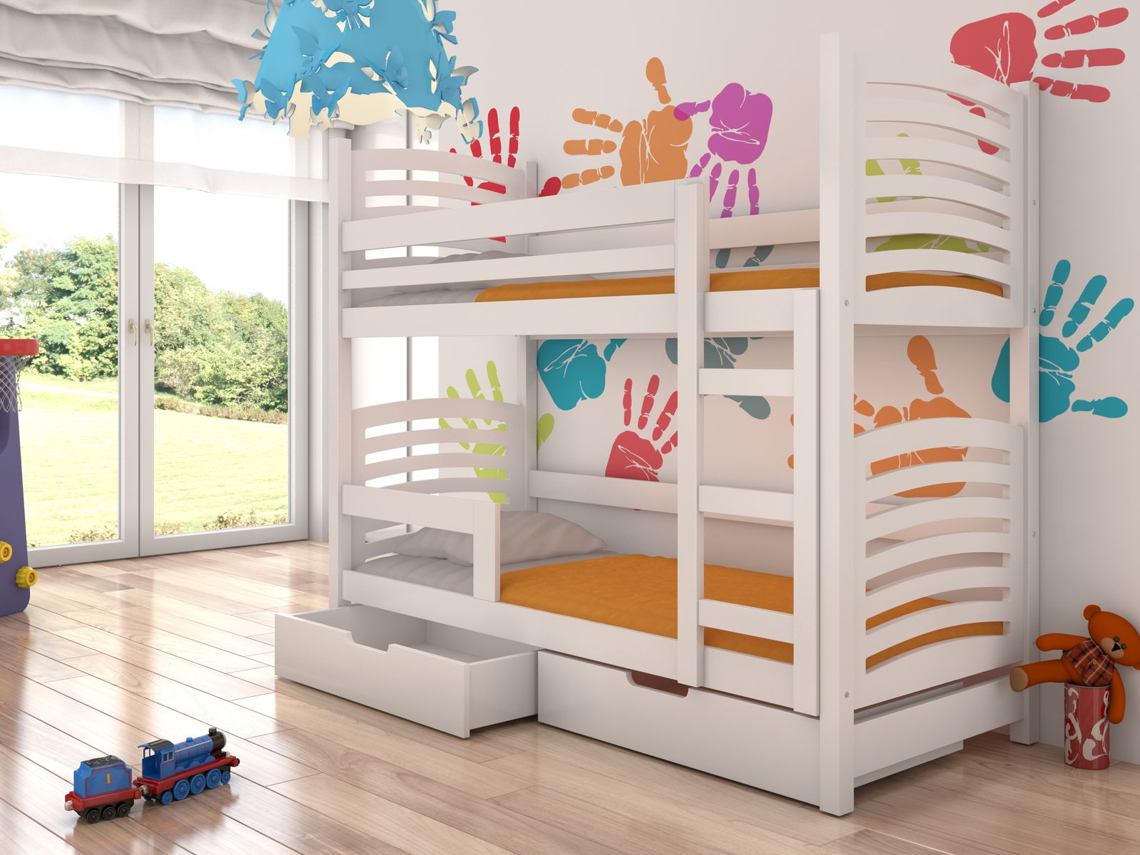 Tato patrová postýlka je víc než jen kousek nábytku – je to místo, kde se sní sny a kde se budují silné pouto mezi sourozenci. OXANA je vyrobena z kvalitního borového dřeva, což přináší do vašeho domova přírodní krásu a teplo. Střed postele a čela zásuvek jsou z MDF desky, která zaručuje pevnost a stabilitu. Tato kombinace materiálů dodává postýlce OXANA stylový a moderní vzhled, který si zaslouží obdiv. Vaše děti budou mít v OXANU výborný spánek. Její rošt je vyroben z pružných lamel, které poskytují optimální podporu a pohodlí. A s pěnovou matrací vybavenou odnímatelným povlakem na zip je čištění a udržování matrace snadné. Vaše děti budou mít zdravý a klidný spánek, aby byly plné energie pro další dobrodružství. Jak je to úžasné mít v jednom místě i úložný prostor! Postýlka OXANA je vybavena dvěma vysouvacími zásuvkami na gumových kolečkách, kde můžete uložit oblečení, knihy a všechny důležité věci. S OXANOU bude pokoj vždy uklizený a organizovaný. Plocha na spaní v OXANu je dvojitá, se standardními rozměry 180 x 75 cm. Každé dítě má své vlastní místo ke spánku, ale stále jsou blízko sebe. Tato postýlka je ideální pro sourozence, kteří chtějí mít společné zážitky a příběhy. A s bariérou proti spadnutí můžete mít jistotu, že vaše děti budou bezpečné a chráněné.