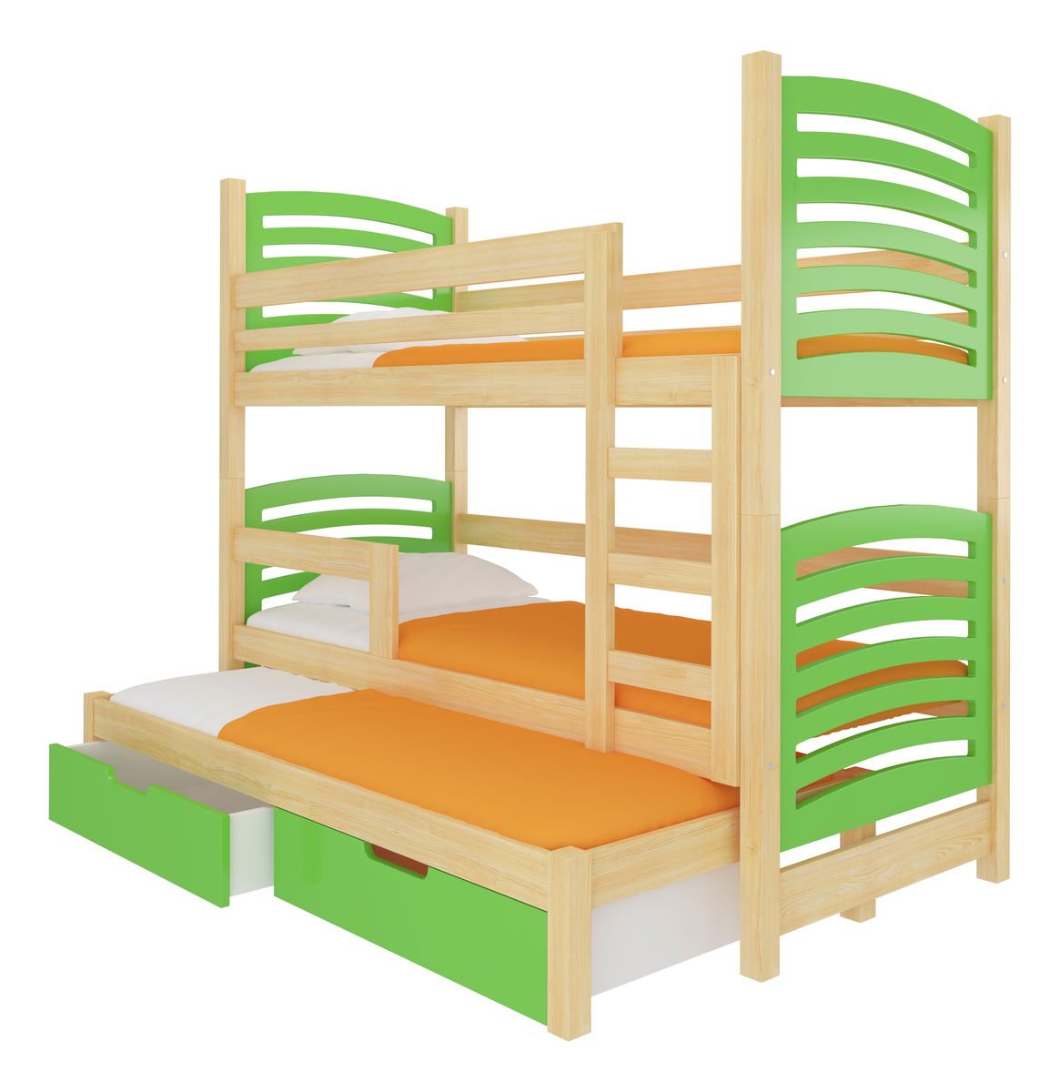 Tato patrová postýlka je vytvořena s láskou a péčí, aby vaše děti měly bezpečný a útulný spánek. STANISLAVA je vyrobena z kvalitního borového dřeva, což přináší do vašeho domova přírodní krásu a teplo. Střed postele a čela šuplíků jsou z MDF desky, která zaručuje pevnost a trvanlivost. Tato kombinace materiálů dodává postýlce STANISLAVA moderní vzhled, který okouzlí každého. Vaše děti si ve STANISLAVU užijí skvělý spánek. Její rošt je vyroben z pružných lamel, které poskytují optimální podporu pro zdravý a pohodlný spánek. A s pěnovou matrací vybavenou odnímatelným povlakem na zip je čištění a udržování matrace jednoduché a praktické. Jaký je to skvost! Postýlka STANISLAVA disponuje dvěma vysouvacími zásuvkami na gumových kolečkách, které poskytují dostatek úložného prostoru pro hračky, knihy a všechny důležité věci. Váš dětský pokoj bude vždy čistý, uklizený a organizovaný. Plocha na spaní ve STANISLAVE je víceúrovňová, s horním lůžkem o rozměru 180 x 75 cm a spodním výsuvným lůžkem o rozměru 172 x 75 cm. Vaše děti budou mít dostatek místa pro pohodlný spánek, a to nejen na horním, ale i na spodním lůžku. S bariérou proti spadnutí můžete mít jistotu, že vaše děti budou bezpečné a chráněné.