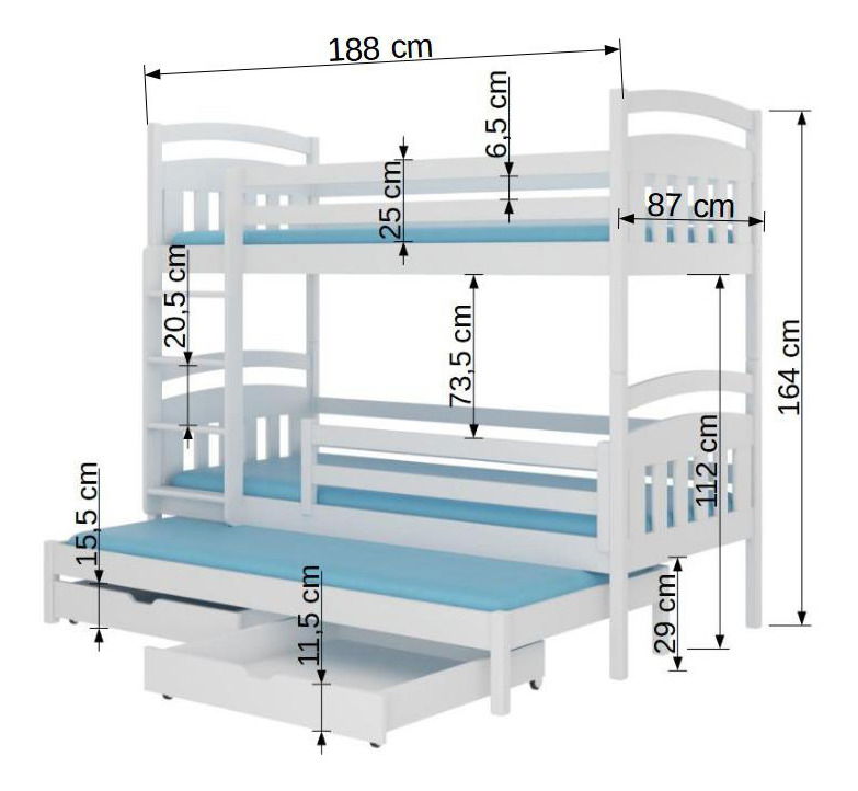 Tato patrová postel přinese do dětského pokoje nejen stylový design, ale také praktické využití prostoru. Je vyrobena z kvalitního borového dřeva, přičemž nohy mají tloušťku 40x40 mm a ostatní prvky tloušťku 20–22 mm, což zaručuje její pevnost a odolnost. Postel ALADÁŘ je vybavena lamelovým roštem o tloušťce 2 cm, který poskytuje optimální oporu a pohodlí. S pěnovou matrací s odnímatelným povlakem na zip bude váš malý miláček spát jako na obláčku. Matrace na spodním výsuvném lůžku je o 10 cm kratší, aby se ideálně přizpůsobila její velikosti. Postýlka ALADÁŘ disponuje také praktickým úložným prostorem. Dvě vysouvací zásuvky na gumových kolečkách vám umožní uschovat hračky, oblečení a další věci, čímž udrží pokoj vašeho dítěte uklizený a organizovaný. S velkorysou plochou na spaní nabízí postýlka ALADÁŘ dostatek místa pro pohodlný spánek. Navíc, třetí lůžko je výsuvné, což umožňuje další příjemné překvapení pro hosty nebo sourozence. Bariéra proti spadnutí na horním lůžku zajišťuje bezpečnost a klidný spánek. ALADÁŘ rovněž nabízí možnost výběru strany žebříku, což umožňuje přizpůsobit postýlku podle preferencí a prostoru v pokoji.