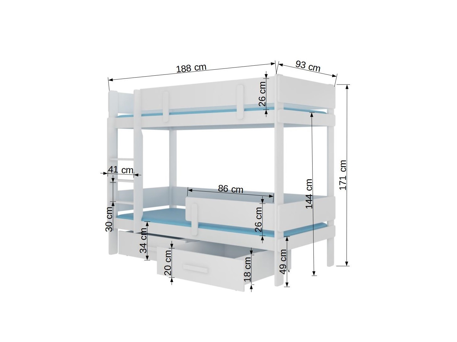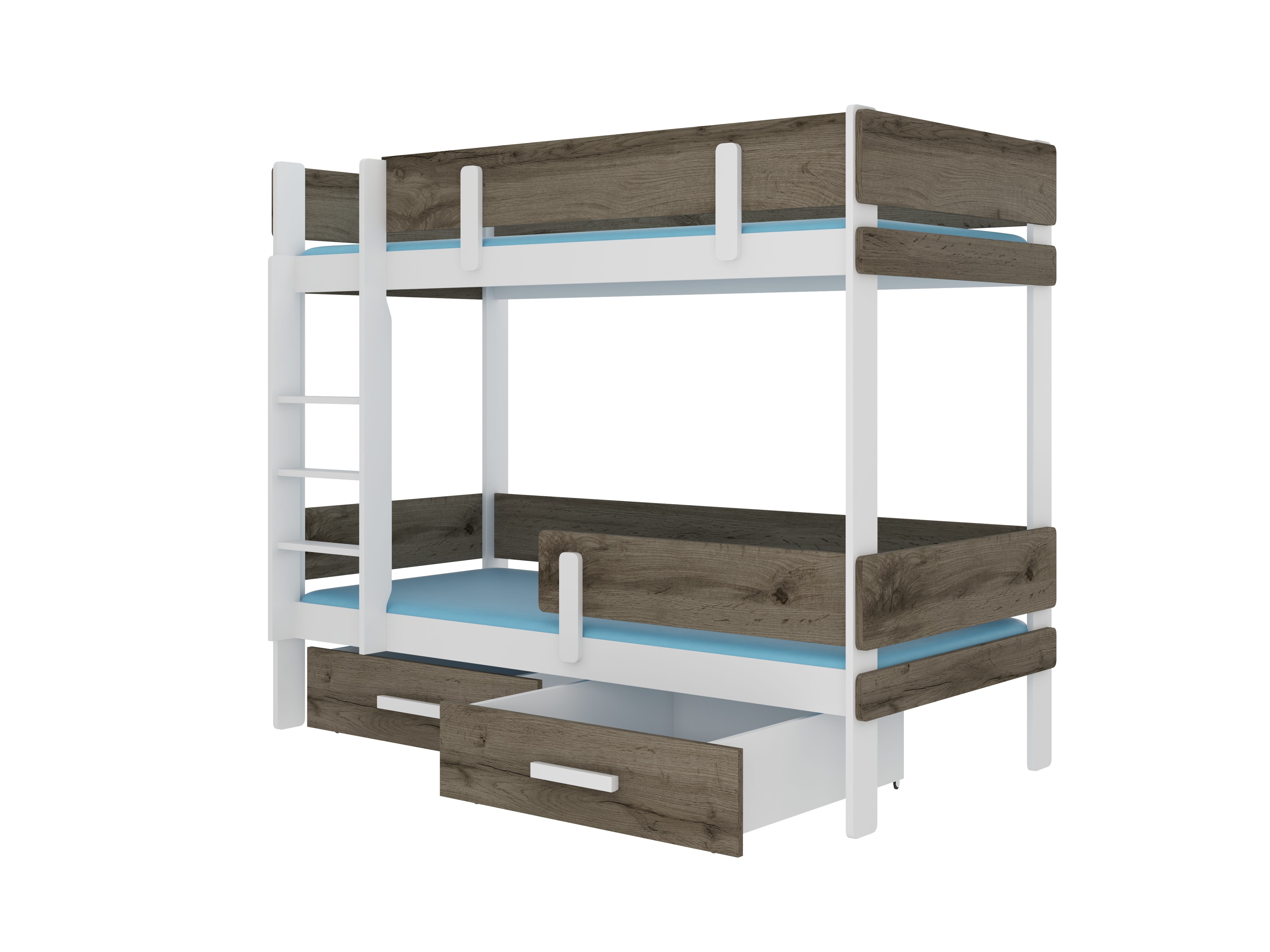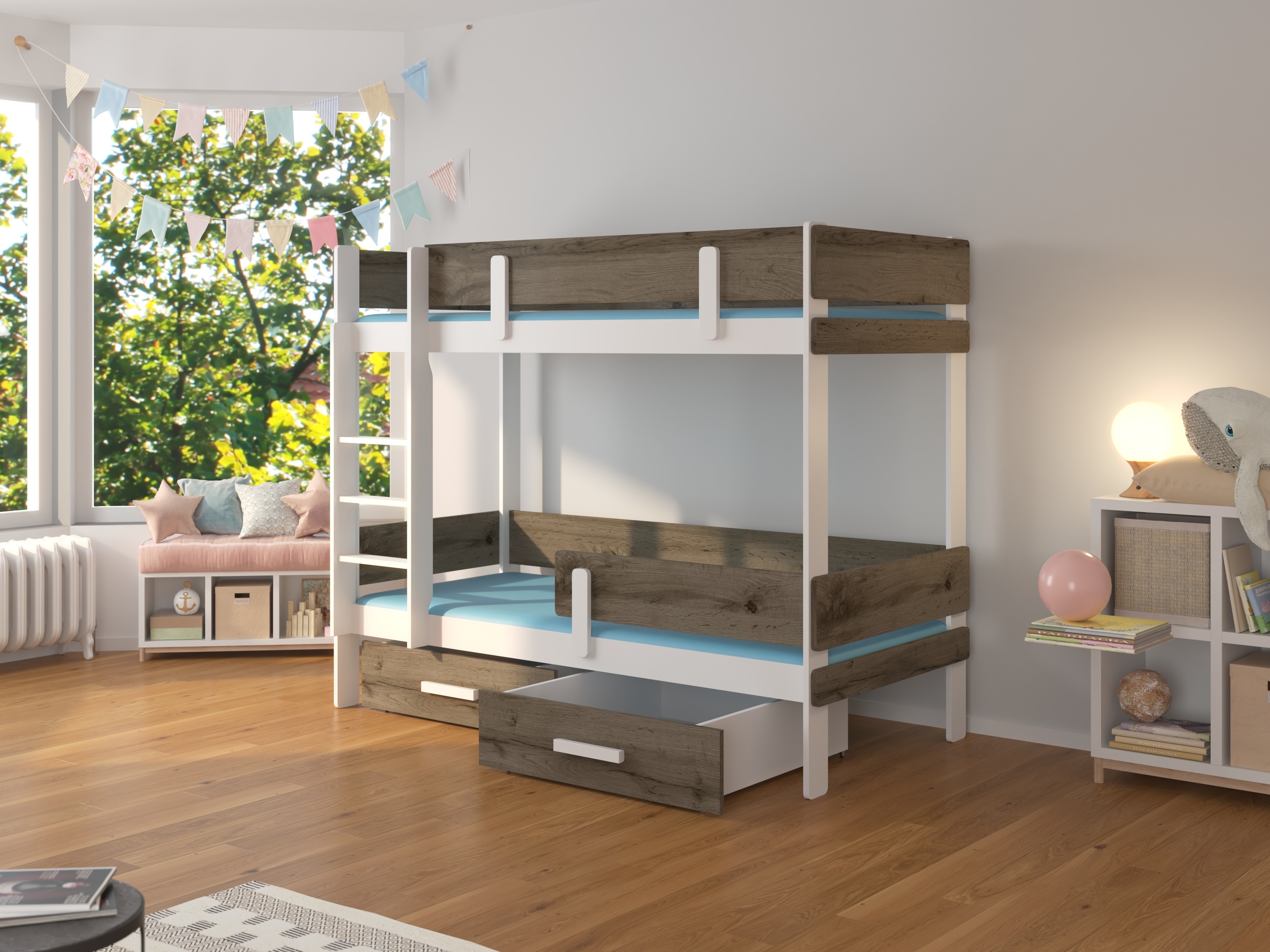 Tato patrová postel je kombinací funkčnosti, moderního designu a vysoce kvalitních materiálů. ELELN je vyrobena z borového dřeva, které dodává posteli přirozený a teplý vzhled. Kombinace s laminovanou deskou o tloušťce 18 mm a ABS hranami zaručuje její odolnost a dlouhou životnost. Postel je vybavena roštem z borovicového dřeva o tloušťce 2 cm, který poskytuje spolehlivou podporu a pohodlí během spánku. Vaše děti se budou cítit pohodlně a bezpečně. Tato matrace poskytuje optimální podporu a pohodlí, aby se vaše děti cítily odpočinuté a plné energie. ELELN disponuje také úložným prostorem, který je řešen ve formě 2x vysouvací zásuvky na válečcích. Tyto zásuvky poskytují praktický prostor pro uložení hraček, oblečení nebo dalších věcí, udržujíc pokoj uklizený a organizovaný. S velkorysou spací plochou mají vaše děti dostatek místa pro pohodlný spánek a relaxaci. Bariéra proti spadnutí je také součástí postele, zajišťující bezpečnost a ochranu během spánku.