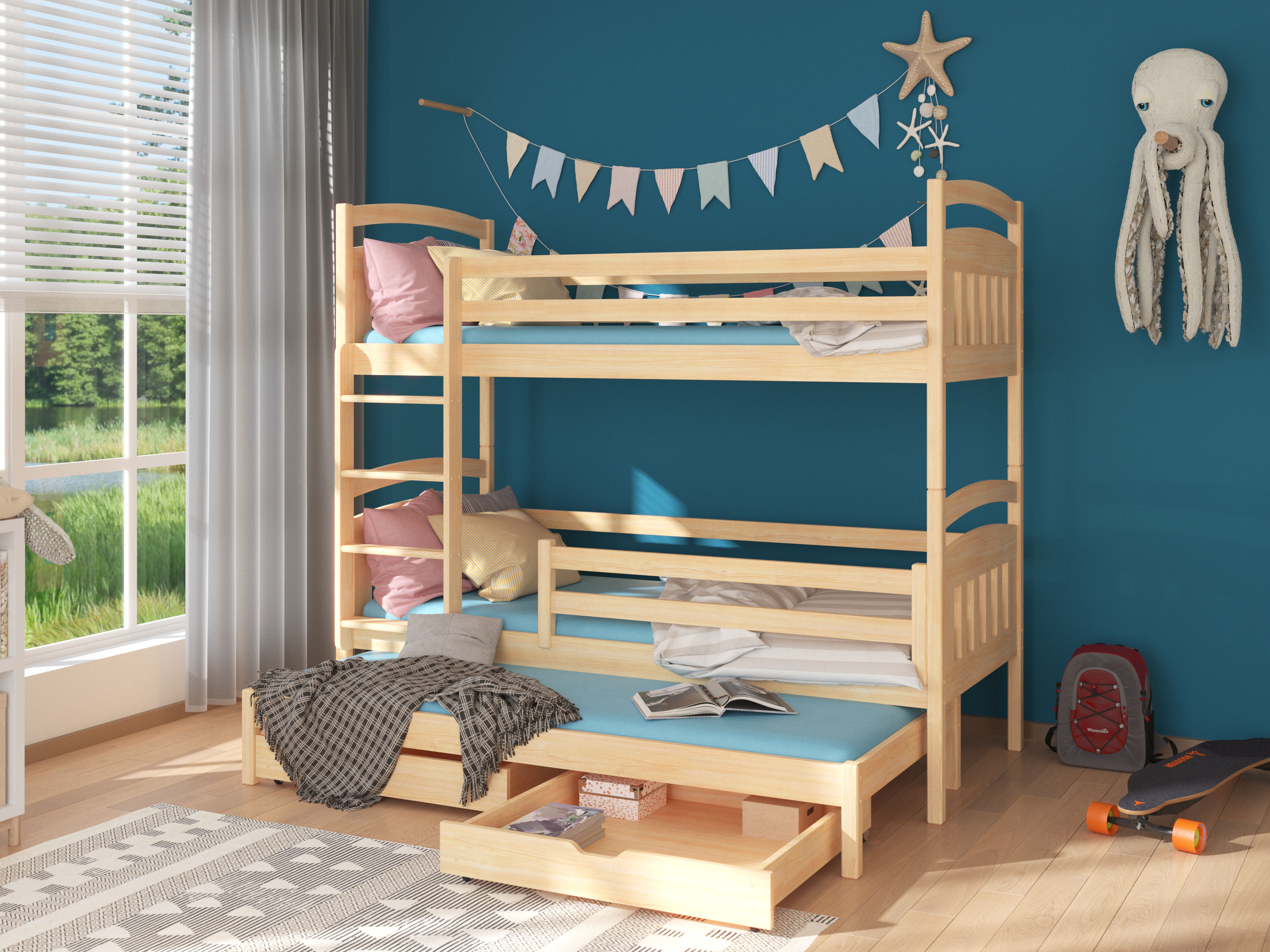 Tato patrová postel přinese do dětského pokoje nejen stylový design, ale také praktické využití prostoru. Je vyrobena z kvalitního borového dřeva, přičemž nohy mají tloušťku 40x40 mm a ostatní prvky tloušťku 20–22 mm, což zaručuje její pevnost a odolnost. Postel ALADÁŘ je vybavena lamelovým roštem o tloušťce 2 cm, který poskytuje optimální oporu a pohodlí. Matrace na spodním výsuvném lůžku je o 10 cm kratší, aby se ideálně přizpůsobila její velikosti. Postýlka ALADÁŘ disponuje také praktickým úložným prostorem. Dvě vysouvací zásuvky na gumových kolečkách vám umožní uschovat hračky, oblečení a další věci, čímž udrží pokoj vašeho dítěte uklizený a organizovaný. S velkorysou plochou na spaní nabízí postýlka ALADÁŘ dostatek místa pro pohodlný spánek. Navíc, třetí lůžko je výsuvné, což umožňuje další příjemné překvapení pro hosty nebo sourozence. Bariéra proti spadnutí na horním lůžku zajišťuje bezpečnost a klidný spánek. ALADÁŘ rovněž nabízí možnost výběru strany žebříku, což umožňuje přizpůsobit postýlku podle preferencí a prostoru v pokoji.