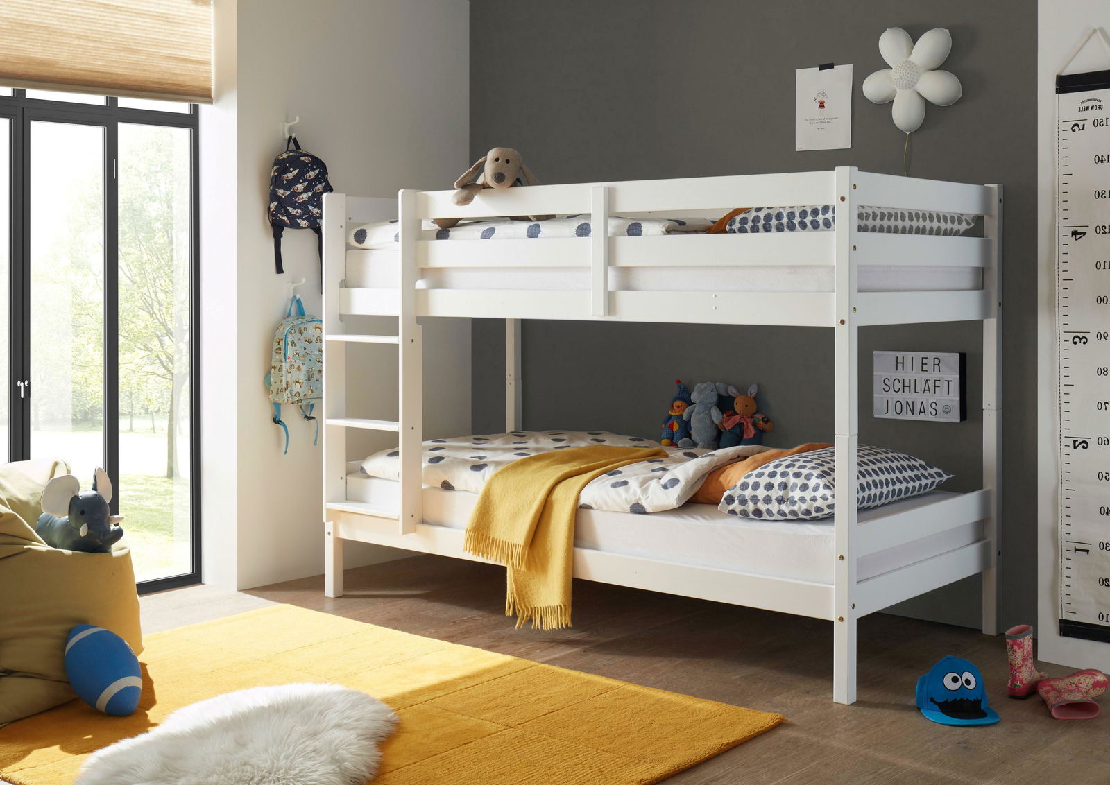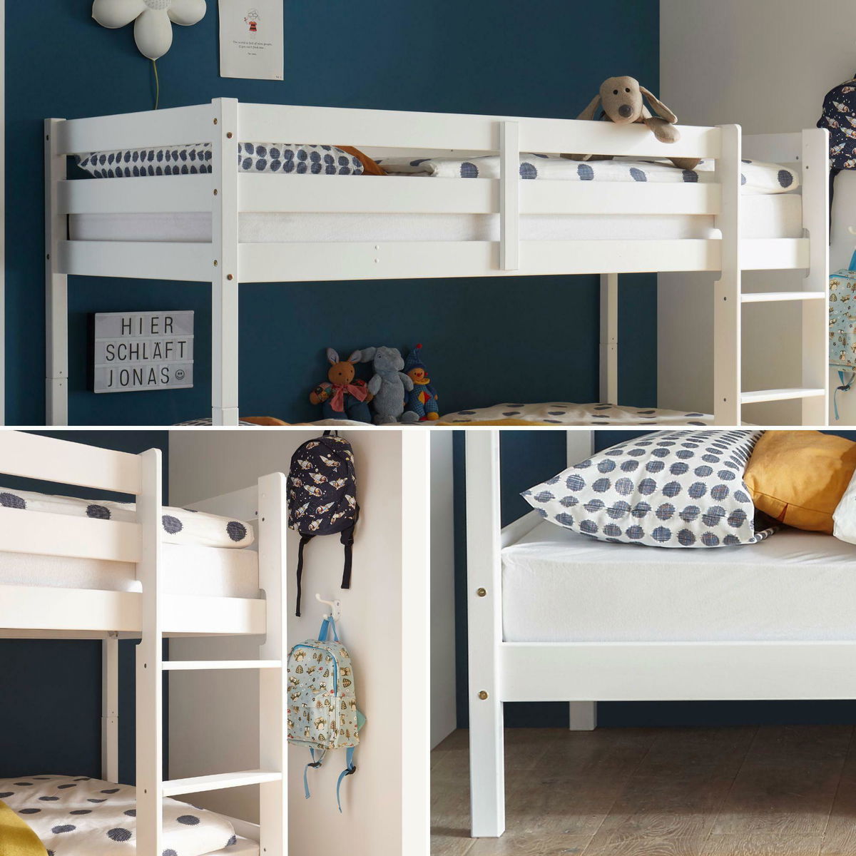 Patrová postel Cerridwen v provedení bílá borovice o velikosti lůžka 90x200cm je kusem nábytku, který Vám bude sloužit dlouhá léta. Vyrobena je z masivního borového dřeva. Její možnost rozložení na 2 samostatná 200x90 cm velká lůžka nebo zachování patrové verze zaručí flexibilitu, a možnost jejího upravení podle vašich reálných potřeb. Postel také přichází spolu se 2 rolovatelnými rošty. Žebřík pro umožnění přístupu do druhého lůžka lze namontovat na levou či pravou stranu. Stabilitu postele zaručují nohy o tloušťce 4,5 x 4,5 cm a její bočnice mají tloušťku 2 cm. Maximální nosnost postele je 100 kg na jedno lůžko a maximální doporučená výška matrace pro horní lůžko je 13 cm. Matrace nejsou součástí dodávky. Volná výška mezi bočním rámem dolního a horního lůžka činí 68 cm. Postel lze také připevnit ke stěně. Pokud hledáte praktickou a odolnou patrovou postel která Vám bude dlouho sloužit, můžete přestat hledat – patrová postel Cerridwen vás právě našla!