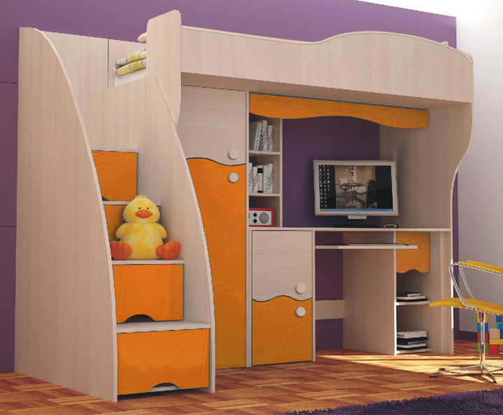 Kombinovaná víceúčelová postel je výborným doplňkem do dětského pokoje. Díky svému designu nabízí množství úložného prostoru v jednom nábytku. Praktický PC stolek doplněný o malý regál a skříň. Postel je v horní části, ke které vedou schody, do kterých jsou důmyslně umístěny zásuvky. Je vyrobena z laminované DTD v barevné kombinaci dřeva jasan a oranžové barvy. Plocha lůžka je 80 x 190 cm. Postel je vybavena roštem, ale bez matrace. Ten máte možnost si přiobjednat v našem obchodě. Hrany jsou ukončeny ABS úpravou, která zvyšuje odolnost vůči mechanickému poškození, udržuje barevnou stálost a odolnost proti vlhkosti.
