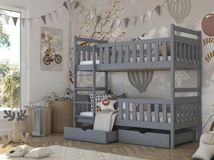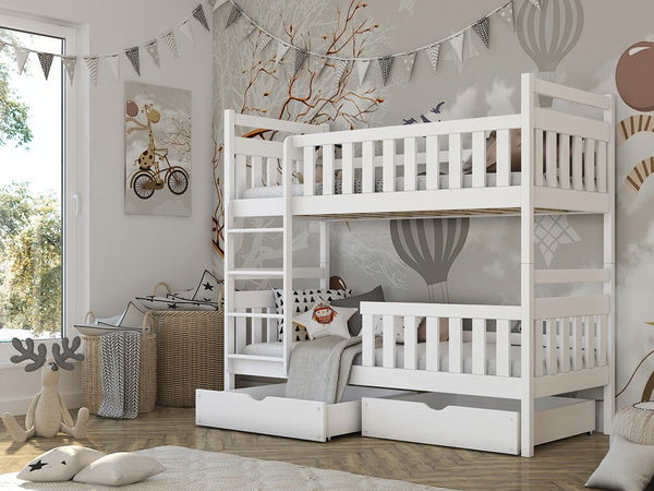 Patrová postel Mikael je klasický model, ale se zvýšenou funkčností. Postel je určena ke spaní pro dvě osoby. Plocha matrace může být následující: 80x180, 90x190, 90x200 - rozměr, pro který se rozhodnete při koupi. Další výhodou palandy Mikael je možnost rozložit ji na dvě samostatné postele. Kromě toho je patrová postel vybavena četnými zábranami, které chrání vaše dítě během spánku, a dvěma šuplíky, které jsou skvělým úložným prostorem na ložní prádlo nebo hračky. Postel je vyrobena z borového dřeva, což dokazuje její vysokou kvalitu. Souprava obsahuje také rám matrace a žebřík.