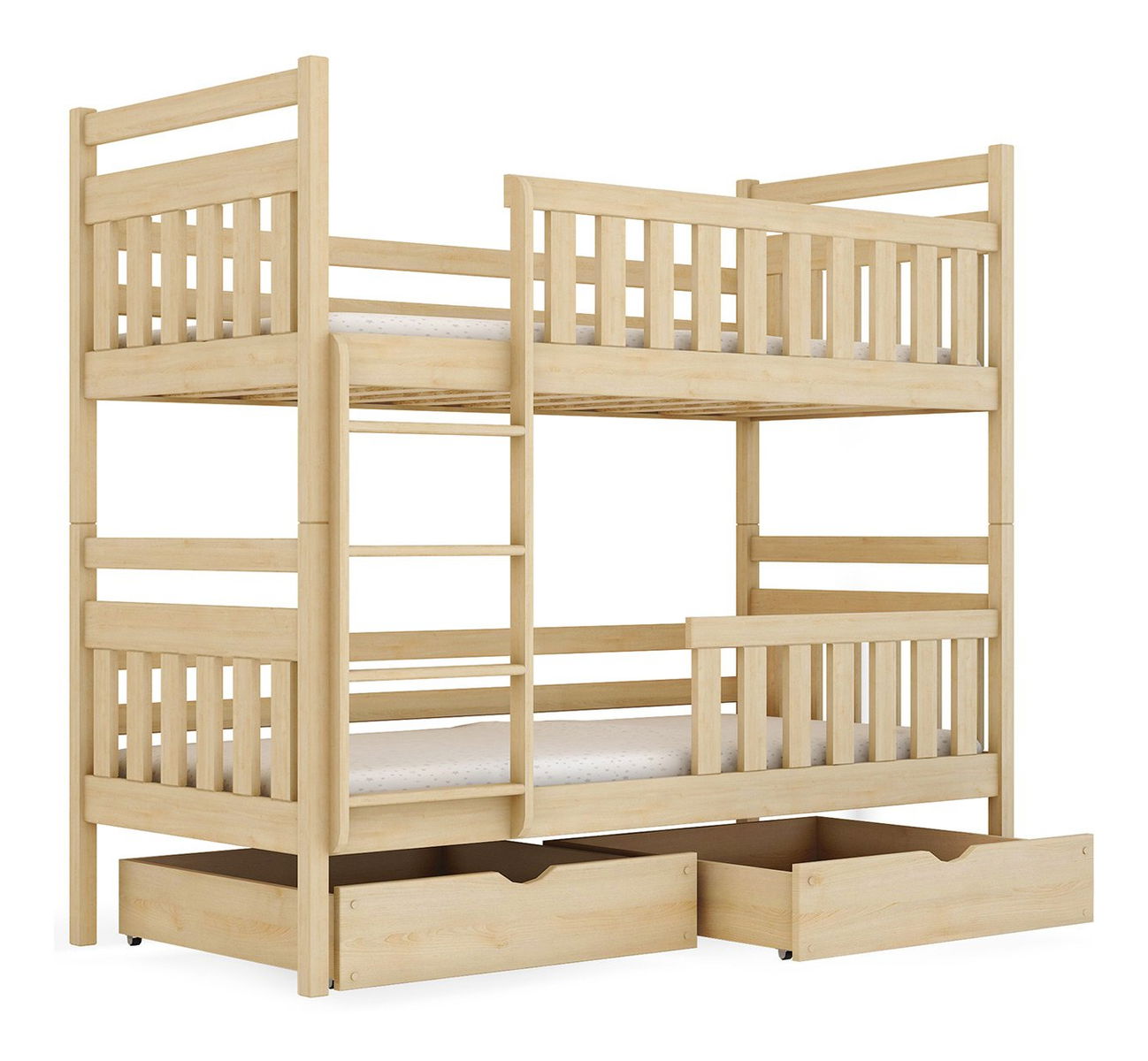 Patrová postel Mikael je klasický model, ale se zvýšenou funkčností. Postel je určena ke spaní pro dvě osoby. Plocha matrace může být následující: 80x180, 90x190, 90x200 - rozměr, pro který se rozhodnete při koupi. Další výhodou palandy Mikael je možnost rozložit ji na dvě samostatné postele. Kromě toho je patrová postel vybavena četnými zábranami, které chrání vaše dítě během spánku, a dvěma šuplíky, které jsou skvělým úložným prostorem na ložní prádlo nebo hračky. Postel je vyrobena z borového dřeva, což dokazuje její vysokou kvalitu. Souprava obsahuje také rám matrace a žebřík.