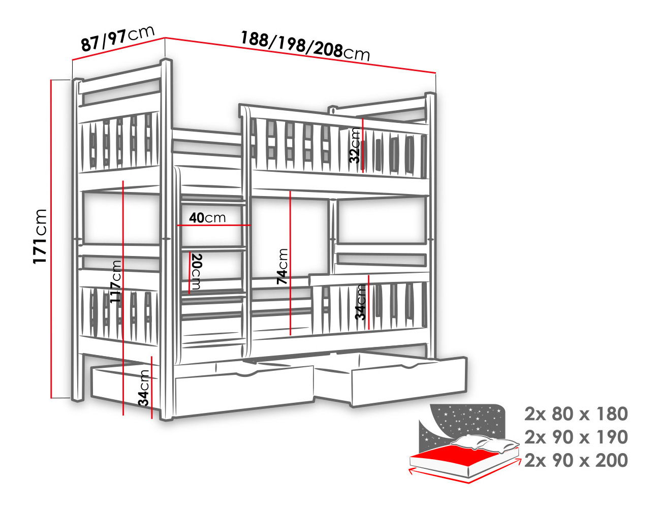 matrace 2x 80 x 180 cm, 2x 90 x 190 cm a 2x 90 x 200 - nejsou součástí balení