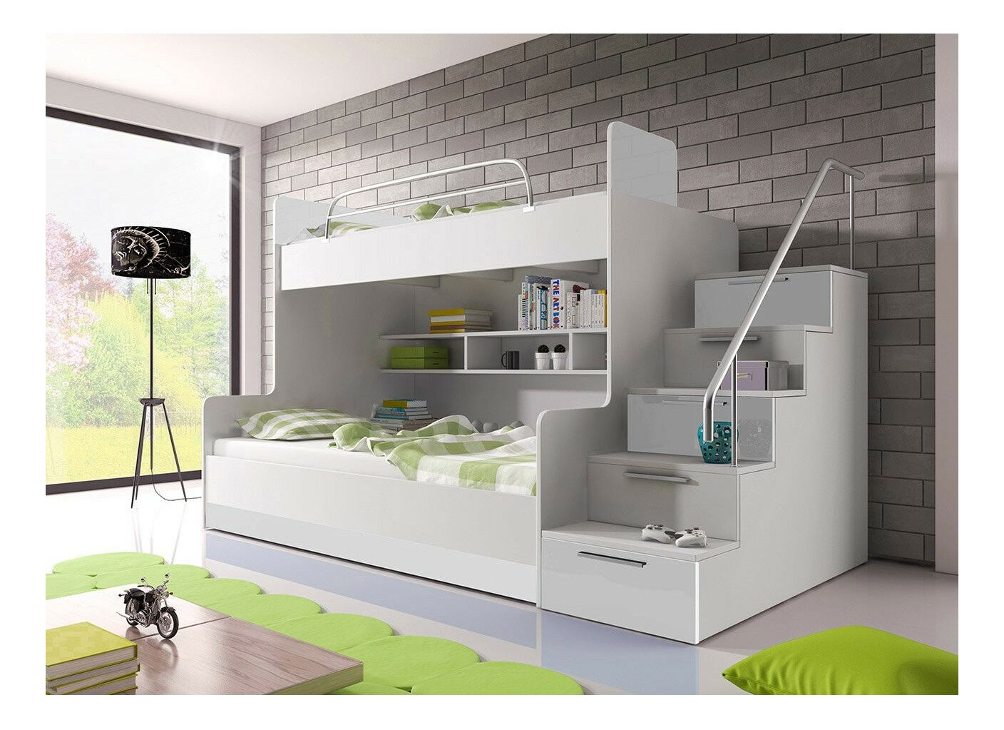 Patrová postel Paralia poskytuje nejlepší podmínky pro každodenní odpočinek pro dvě děti. Tento moderní a multifunkční nábytek poskytuje kromě standardní funkce pro spaní i dobře uspořádaný prostor pro ukládání ručních předmětů. Žebřík vedoucí k hornímu lůžku je zde nahrazen schody s bezpečnostní bariérou nesoucí dítě. Další výhodou jsou prostorné úložné prostory skryté v každém z kroků. Díky této kombinaci je patrová postel se schody úspěšně nahrazena komodu a dokonce i šatníku. Všechny tyto inovace potvrzují, že Paralia je ideální i v malé sourozenecké místnosti.