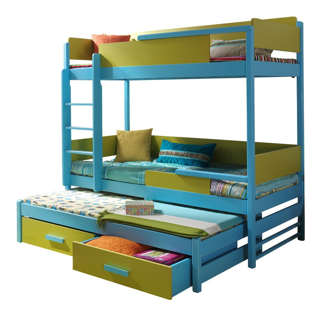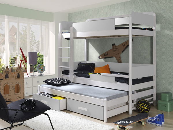 Patrová postel je ideální volbou pro ty, kteří hledají pohodlí a styl. Patrová postel Stagioni 200 je oblíbeným řešením pro malé dětské pokoje. Poskytuje pohodlné místo k odpočinku pro tři osoby. Postel je vyrobena z pevných materiálů - borová struktura dřeva v kombinaci s laminovanou deskou, která zajišťuje stabilní strukturu. Tento model byl vybaven praktickými úložnými prostory ve formě zásuvek, které umožní maximální využití volného prostoru pod postelí, díky čemuž je mimořádně funkční. Patrová postel je k dispozici v několika barvách, které odpovídají uspořádání dětských pokojů. V další možnosti je možné pořídit si dokonale sladěné matrace, které zajistí přiměřenou oporu těla. Rozměry: délka: 208 cm, šířka: 98 cm, výška: 183 cm, horní plocha na spaní: 90 x 200 cm, střední plocha na spaní: 90 x 200 cm, dolní plocha na spaní: 90 x 190 cm, Provedení: borovicové dřevo + laminovaná deska 2 cm silného borovicového dřeva (válcovaný rám) má úložný prostor na podestýlku (ve formě zásuvky), pokryté akrylovými barvami kromě postele v barvě grafitu - natřené skvrnami od vody, možnost zakoupení dalších tří matrací: spodní matrace - pěna s výškou 8 cm, střední matrace - pěna 8 cm, dvoulůžkové matrace 90 x 200 a 90 x 190 - nejsou součástí dodávky, lze je přiřadit a zakoupit zde Záruka: 24 měsíců