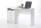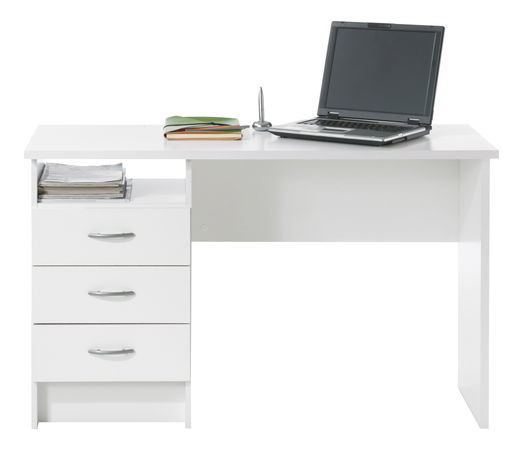 Bílý PC stolek se třemi zásuvkami a úložným prostorem na levé straně.