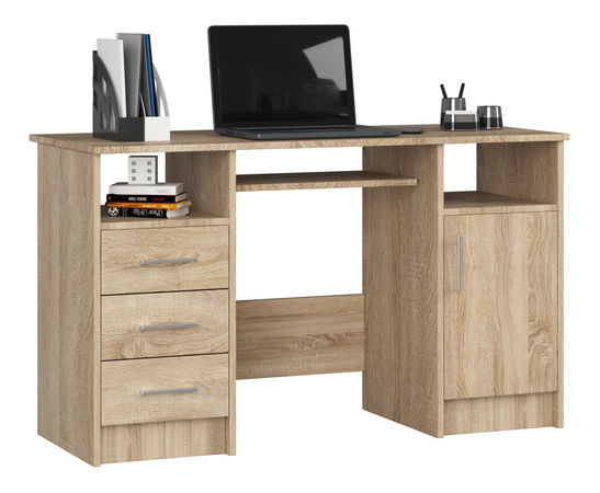 Psací stůl Aziza je vyroben z laminované desky o tloušťce 16 milimetrů. Tento materiál je vysoce odolný vůči oděru a různým druhům poškození. Hrany nábytku jsou pokryty vysokopevnostní ABS hranou. Produkt je určen do kanceláře, ale také do domácí pracovny či do studentského pokoje. Skvěle se bude hodit do klasicky řešených i moderních interiérů a umožní vám pracovat nebo studovat ve vhodných podmínkách. Čela zásuvek a dvířek jsou vyrobena z laminované desky. Uvnitř dveří se nachází jedna police a zásuvky a police na klávesnici se pohybují na kovových válečkových vodítkách. Dostupný ve více barevných provedeních.
