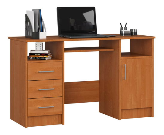 Psací stůl Aziza je vyroben z laminované desky o tloušťce 16 milimetrů. Tento materiál je vysoce odolný vůči oděru a různým druhům poškození. Hrany nábytku jsou pokryty vysokopevnostní ABS hranou. Produkt je určen do kanceláře, ale také do domácí pracovny či do studentského pokoje. Skvěle se bude hodit do klasicky řešených i moderních interiérů a umožní vám pracovat nebo studovat ve vhodných podmínkách. Čela zásuvek a dvířek jsou vyrobena z laminované desky. Uvnitř dveří se nachází jedna police a zásuvky a police na klávesnici se pohybují na kovových válečkových vodítkách. Dostupný ve více barevných provedeních.