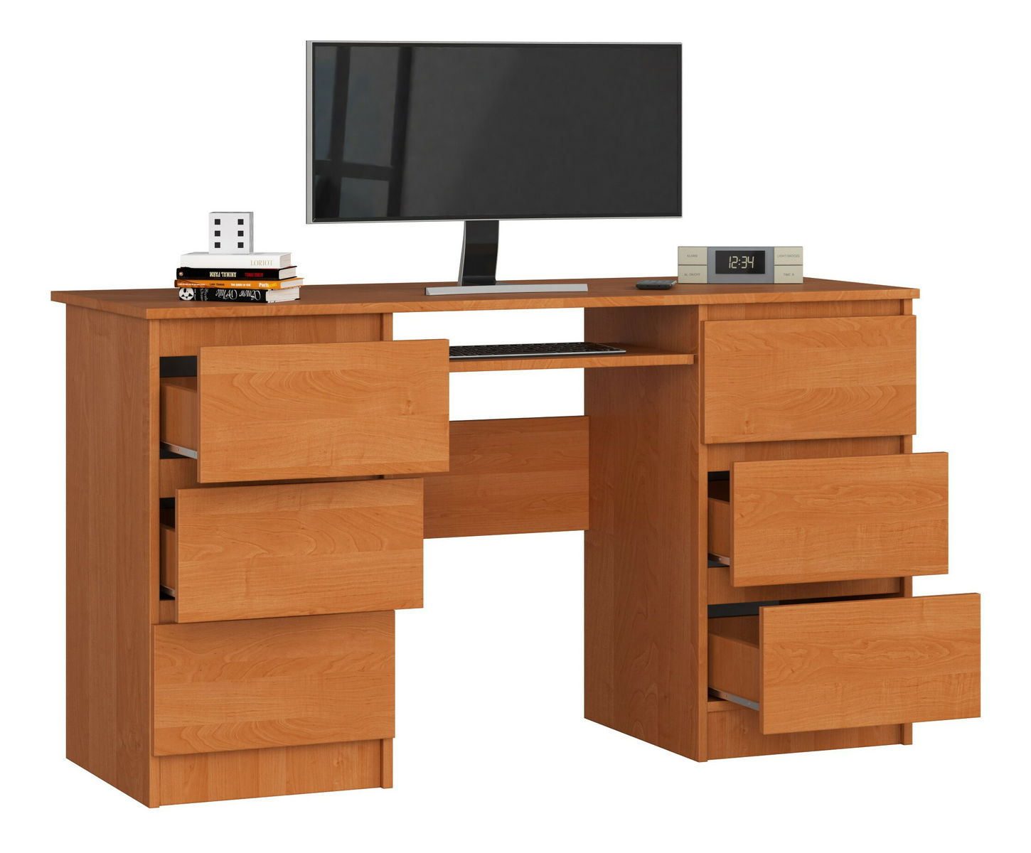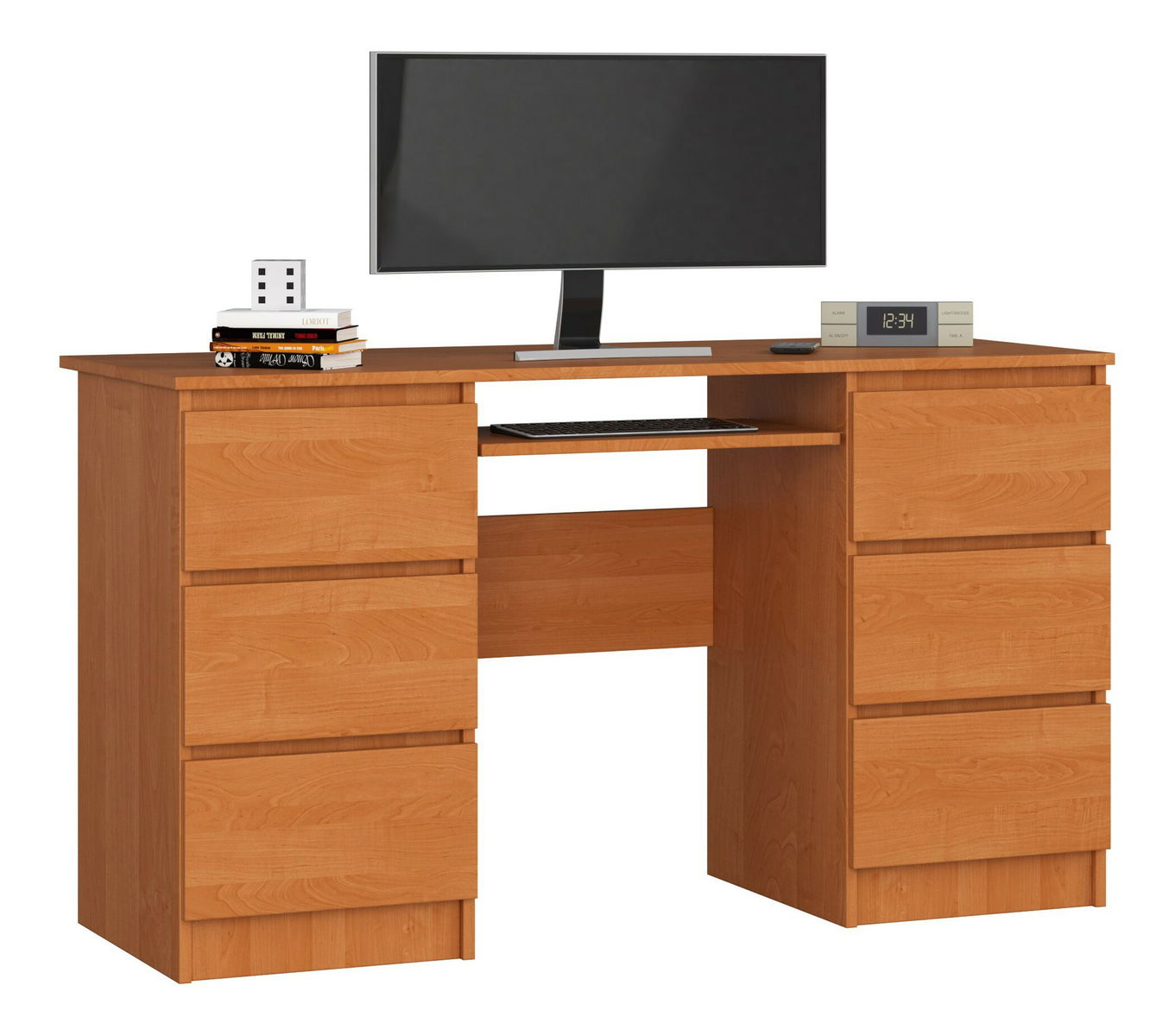 ZobrazitPředstavujeme kvalitní počítačový stůl Behati, zajišťující vysoký pracovní komfort a dostatečný prostor pro uložení školních potřeb nebo počítačového příslušenství, jako jsou disky, přenosné paměti a jiné drobné vybavení. Je vyroben z kvalitního materiálu, lamino desky o tloušťce 16 mm. Rozměry psacího stolu jsou 135×70×55 cm, což plně postačuje pro pohodlné učení, hru či práci. Na desku stolu lze umístit stolní počítač, notebook nebo jiné zařízení, například herní konzoli. Stůl je vybaven 6 zásuvkami a policí na klávesnici. Deska i čela prezentovaného stolu jsou odolná vůči oděru, díky tomu neztrácí nábytek svůj estetický vzhled, i když je často používán. Všechny hrany jsou navíc chráněny ABS hranou proti mechanickému poškození, například při nárazu židle. Zásuvky a police klávesnice jsou umístěny na kovových vodicích válečcích, díky čemuž je jejich otevírání a zavírání plynulé a nevyžaduje použití velké síly. Dostupný ve více barevných provedeních.