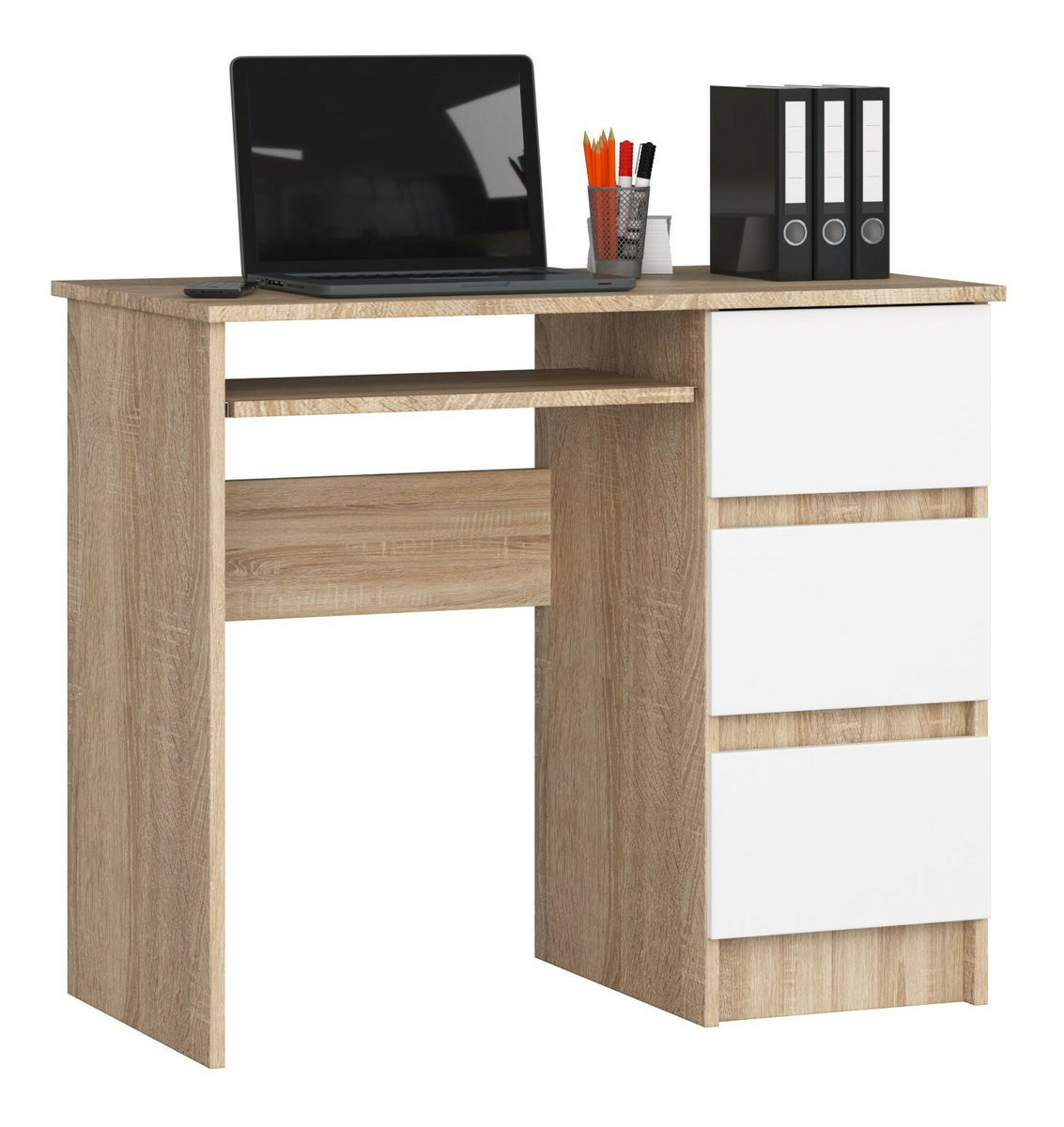 ZobrazitPrezentovaný počítačový stůl Benicio je 90 cm dlouhý, 77 cm vysoký a 50 cm hluboký a jeho hmotnost je 30 kg. Je vyroben z kvalitní laminované desky, odolné vůči oděru. Hrany psacího stolu jsou pokryty ABS hranou, která zabraňuje lehkému poškození nábytku. Stůl nabízí také spoustu volného místa, které lze uspořádat a využít dle vlastního uvážení. To vše díky třem zásuvkám – každá z nich má uvnitř jednu poličku. Součástí stolu je také police na klávesnici, která se snadno a volně pohybuje díky kovovým válečkovým vodítkům. Nábytek je vyroben z kvalitních materiálů, takže si dlouho zachová svůj dokonalý vzhled. Výhodou pc stolku Benicio je jeho estetický vzhled a atraktivní cena. Určitě splní všechna očekávání z hlediska funkčnosti a estetiky. Dostupný ve více barevných provedeních.