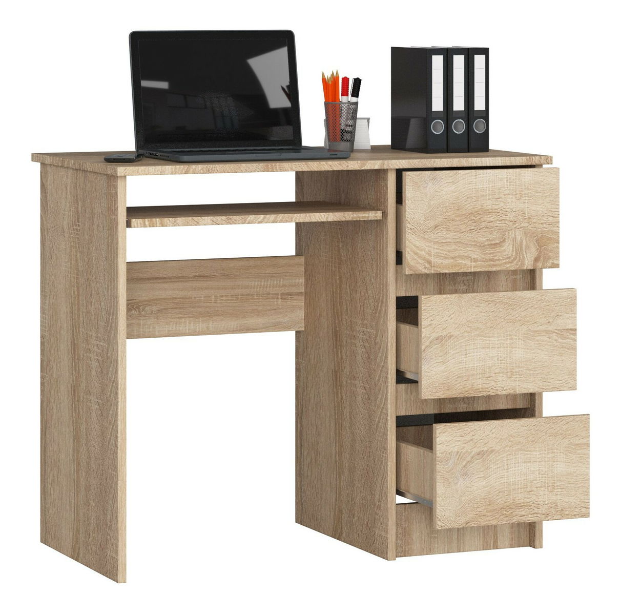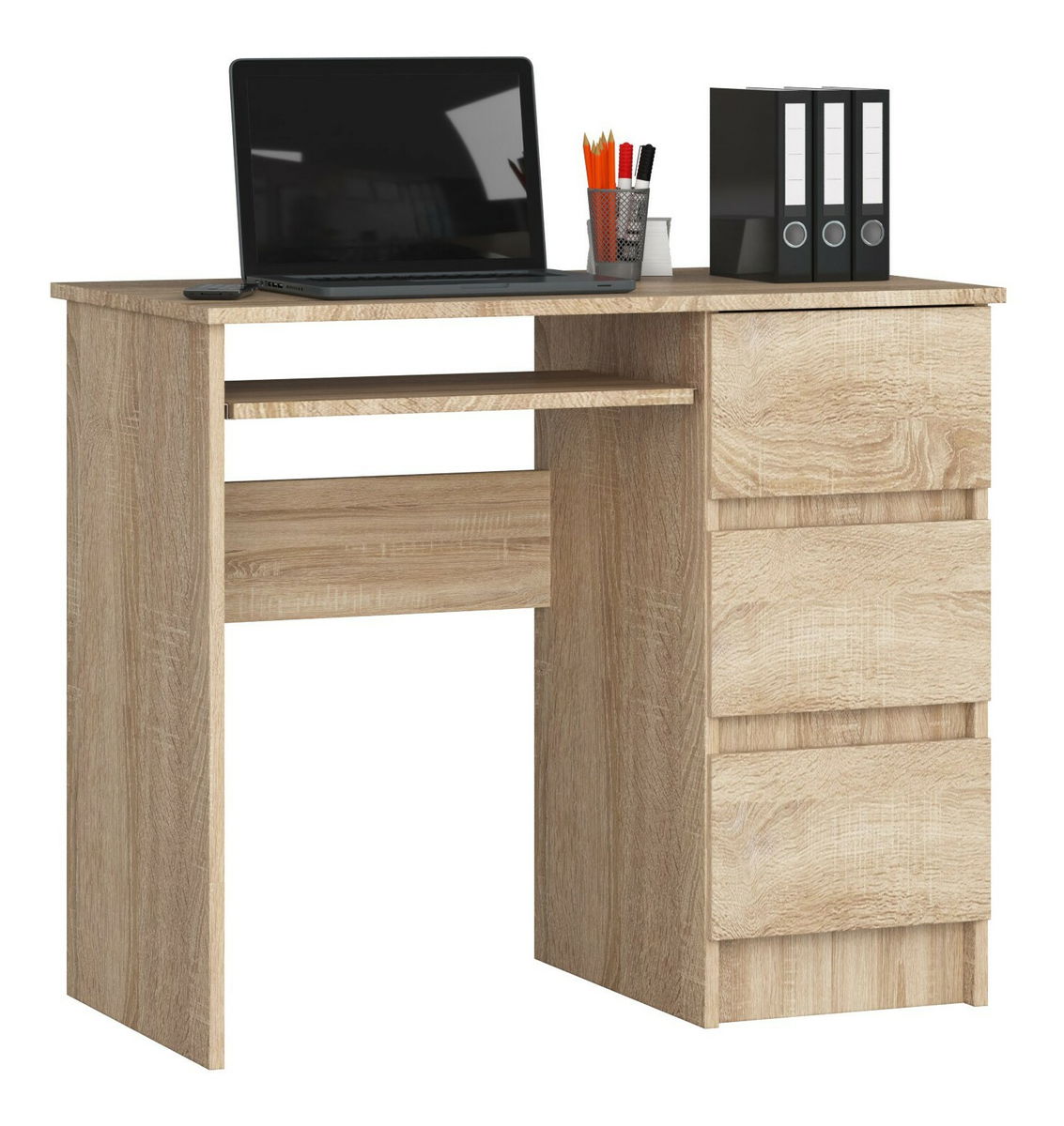 ZobrazitPrezentovaný počítačový stůl Benicio je 90 cm dlouhý, 77 cm vysoký a 50 cm hluboký a jeho hmotnost je 30 kg. Je vyroben z kvalitní laminované desky, odolné vůči oděru. Hrany psacího stolu jsou pokryty ABS hranou, která zabraňuje lehkému poškození nábytku. Stůl nabízí také spoustu volného místa, které lze uspořádat a využít dle vlastního uvážení. To vše díky třem zásuvkám – každá z nich má uvnitř jednu poličku. Součástí stolu je také police na klávesnici, která se snadno a volně pohybuje díky kovovým válečkovým vodítkům. Nábytek je vyroben z kvalitních materiálů, takže si dlouho zachová svůj dokonalý vzhled. Výhodou pc stolku Benicio je jeho estetický vzhled a atraktivní cena. Určitě splní všechna očekávání z hlediska funkčnosti a estetiky. Dostupný ve více barevných provedeních.
