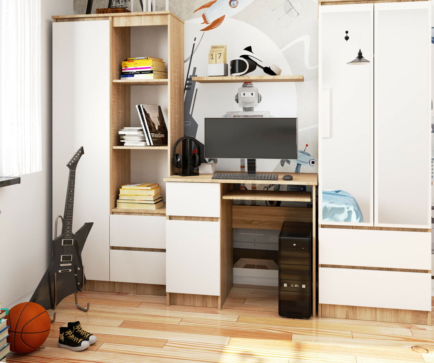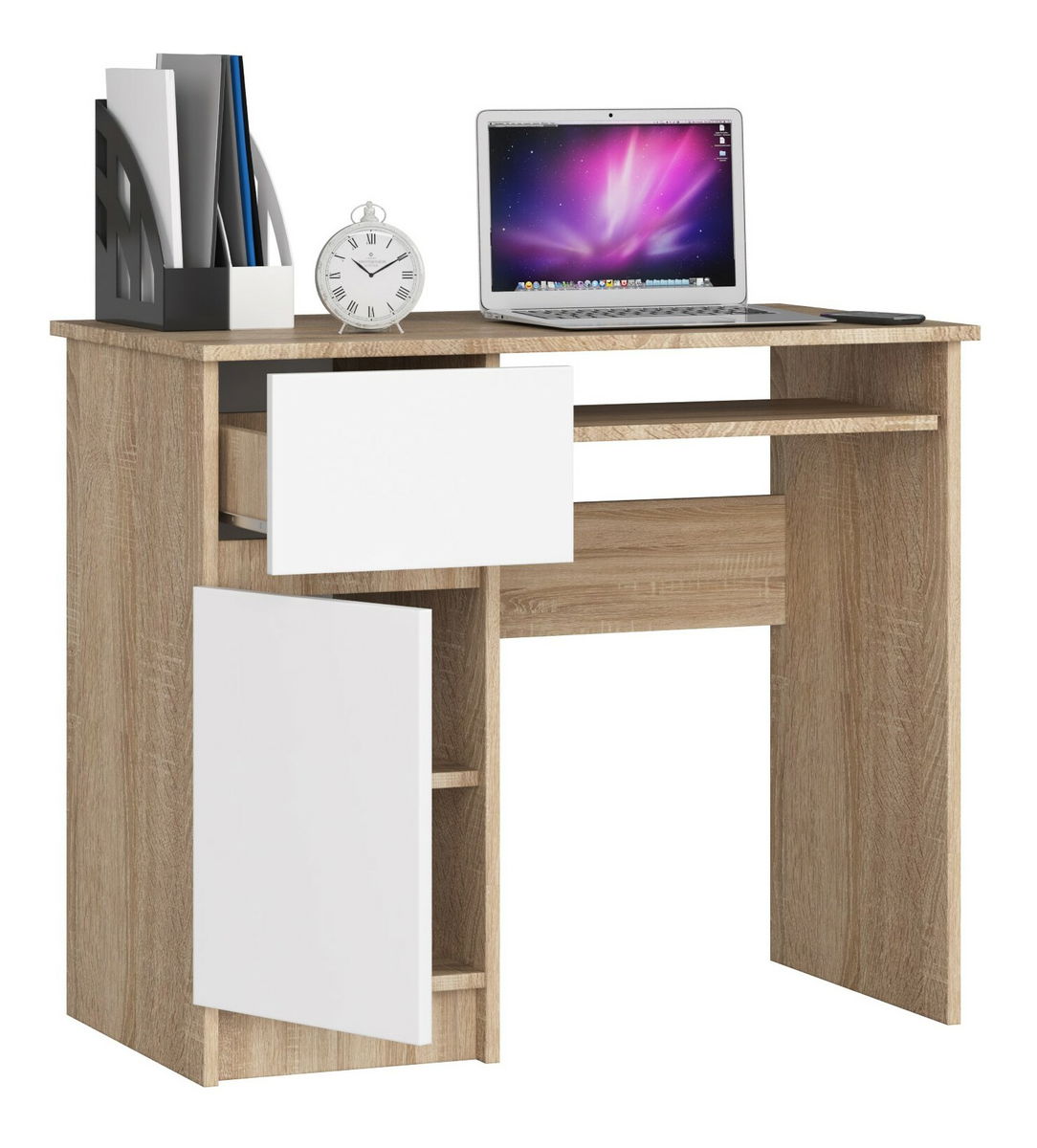 ZobrazitPočítačový stůl Bhaskar je malý stůl s dostatkem prostoru pro nejnutnější věci do školy. Díky dvířkům se do ní vejde spousta sešitů a knih. Psací stůl má délku 90 cm a je jako stvořený do malých a středně velkých místností, do kanceláře i do obývacího pokoje – domácí pracovny, teenagerského či dětského pokoje. Stolek se skládá ze stolové desky, výsuvné police na klávesnici, zásuvky a skříňky za dvířky. PC stolek Bhaskar je vyroben z laminované desky odolné proti oděru. Zásuvka a police klávesnice se posouvají díky kovovým válečkovým vodítkům. Viditelné hrany jsou kryty ABS hranou, která zaručuje odolnost proti poškození. Uvnitř dvířek je jedna police. Dostupný ve více barevných provedeních.