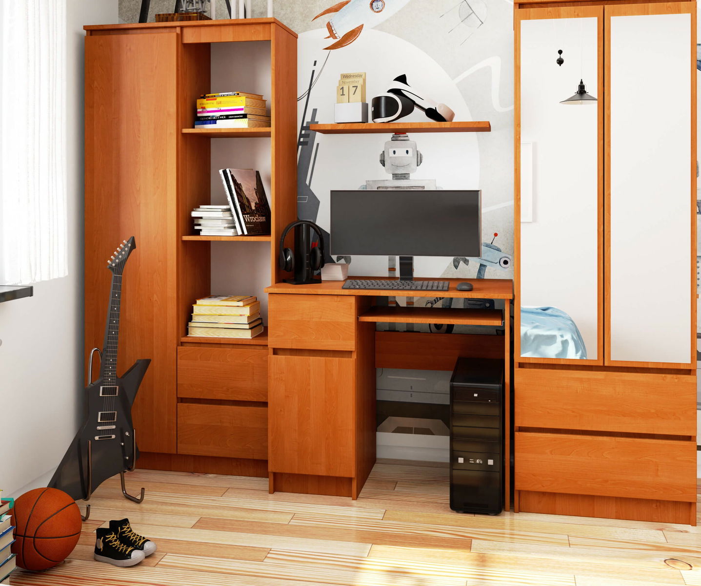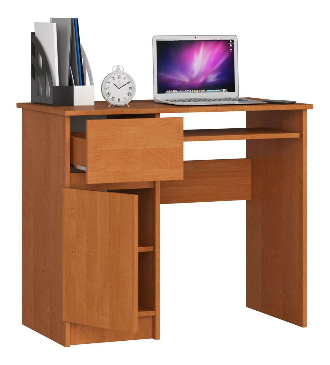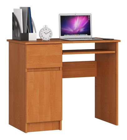 ZobrazitPočítačový stůl Bhaskar je malý stůl s dostatkem prostoru pro nejnutnější věci do školy. Díky dvířkům se do ní vejde spousta sešitů a knih. Psací stůl má délku 90 cm a je jako stvořený do malých a středně velkých místností, do kanceláře i do obývacího pokoje – domácí pracovny, teenagerského či dětského pokoje. Stolek se skládá ze stolové desky, výsuvné police na klávesnici, zásuvky a skříňky za dvířky. PC stolek Bhaskar je vyroben z laminované desky odolné proti oděru. Zásuvka a police klávesnice se posouvají díky kovovým válečkovým vodítkům. Viditelné hrany jsou kryty ABS hranou, která zaručuje odolnost proti poškození. Uvnitř dvířek je jedna police. Dostupný ve více barevných provedeních.