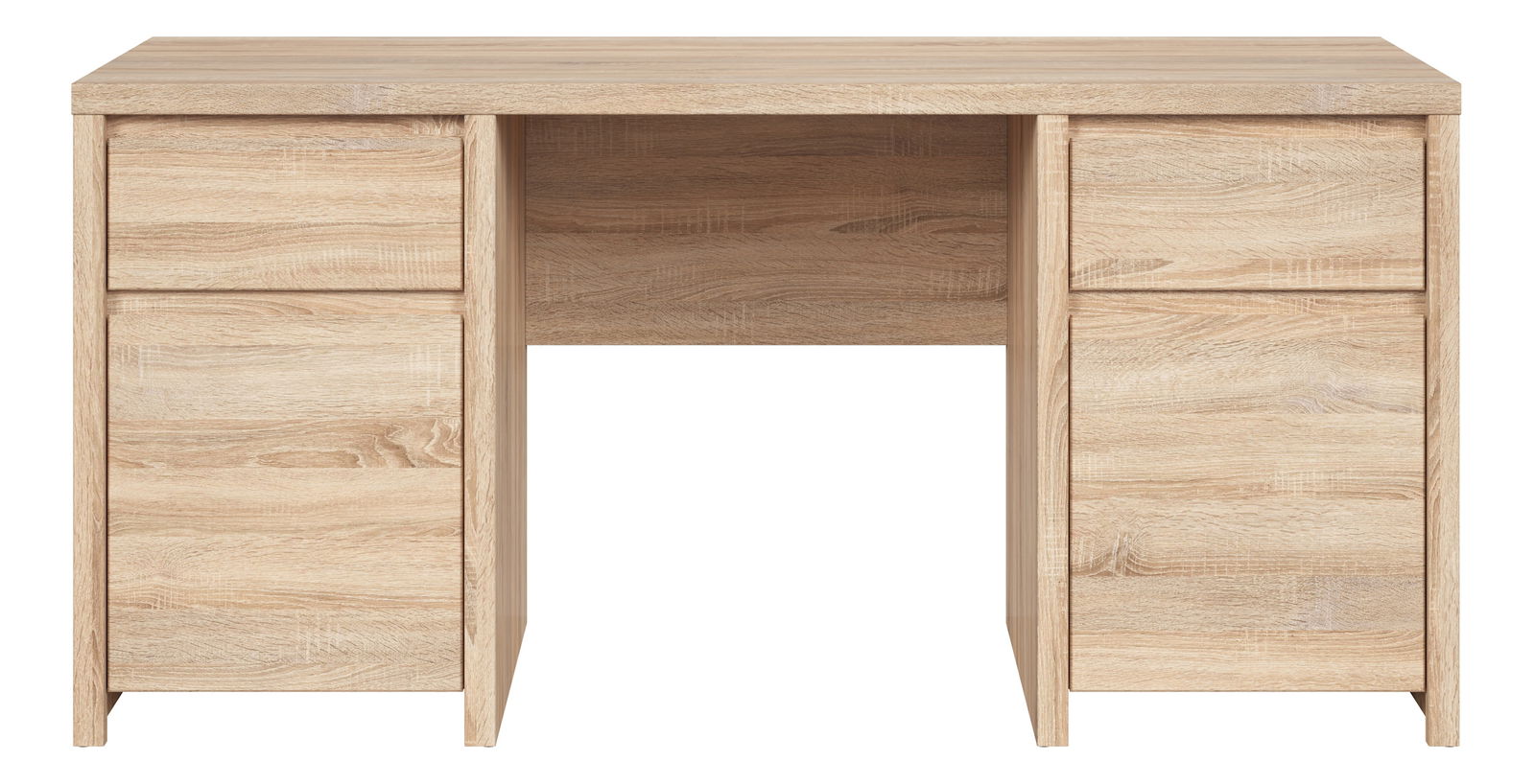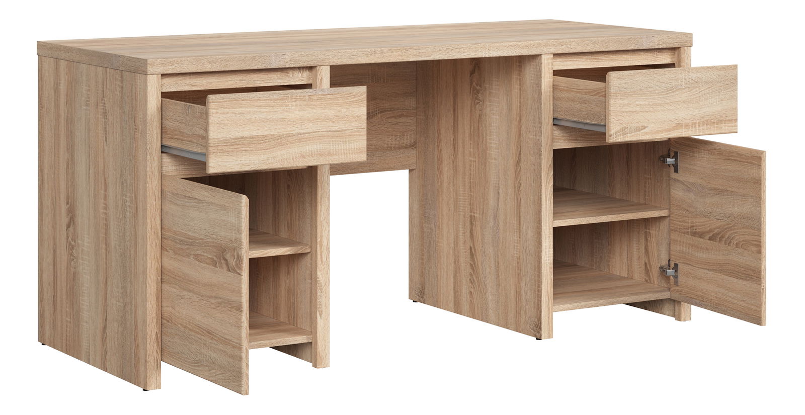 Praktický PC stolek jednoduchého designu, kterým si zařídíte kancelář, pracovnu, ale je vhodný i do dětského a studentského pokoje. PC stolek má na pravé i levé straně zásuvku a dvířka, které poskytují další úložný prostor na odložení kancelářských potřeb a jiných drobností. Zesílené strany a vrchní část dodatečně zpevňují konstrukci, která je tak odolnější vůči mechanickému poškození. Systém kolejniček poskytuje snadnou manipulaci se zásuvkami. Přední hrana dvířek a čel zásuvek umožňuje bezúchytové otevírání.