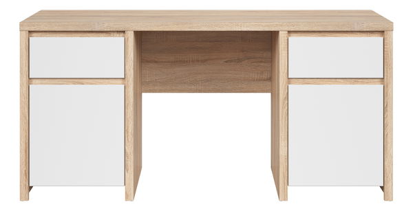 Praktický PC stolek jednoduchého designu, kterým si zařídíte kancelář, pracovnu, ale je vhodný i do dětského a studentského pokoje. PC stolek má na pravé i levé straně zásuvku a dvířka, které poskytují další úložný prostor na odložení kancelářských potřeb a jiných drobností. Zesílené strany a vrchní část dodatečně zpevňují konstrukci, která je tak odolnější vůči mechanickému poškození. Systém kolejniček poskytuje snadnou manipulaci se zásuvkami. Přední hrana dvířek a čel zásuvek umožňuje bezúchytové otevírání.