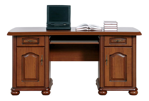 Nádherně zdobený PC stolek v rustikálním stylu bude elgeantným doplňkem vašich pracoven. Stolek má dvě krásné zdobené skříňky a zásuvky na levé a pravé straně a výsuvnou desku pod klávesnici uprostřed. Stolek stojí na kulatých a hrubých nožičkách.