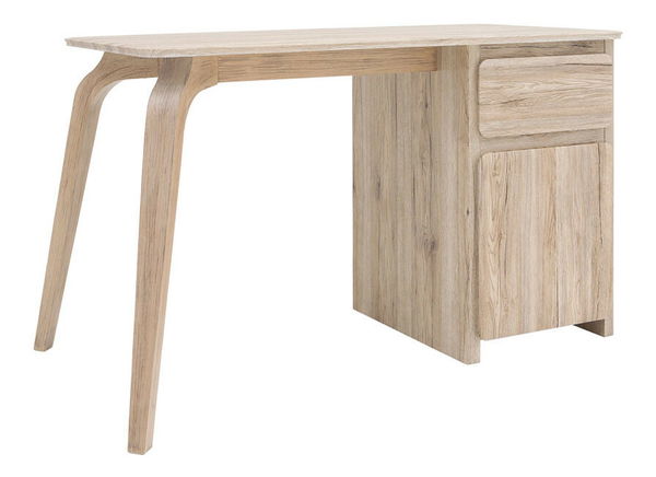 Zajímavý designový PC stolek pro studenty a teenagery. PC stolek má zaoblené nohy a v pravé části se nachází skříňka s dvířky a zásuvkou. Dvířka a zásuvka stolku mají oblé rohy a nemají úchyty.