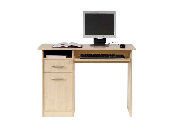 Moderní PC stolek vhodný do studentského pokoje, který má v levé části zásuvku a skříňku. Nad nimi se nachází menší otevřená polička, kde si můžete odložit knížky, dokumenty nebo kancelářské potřeby. Má také praktickou vysouvací podložku pod klávesnici.