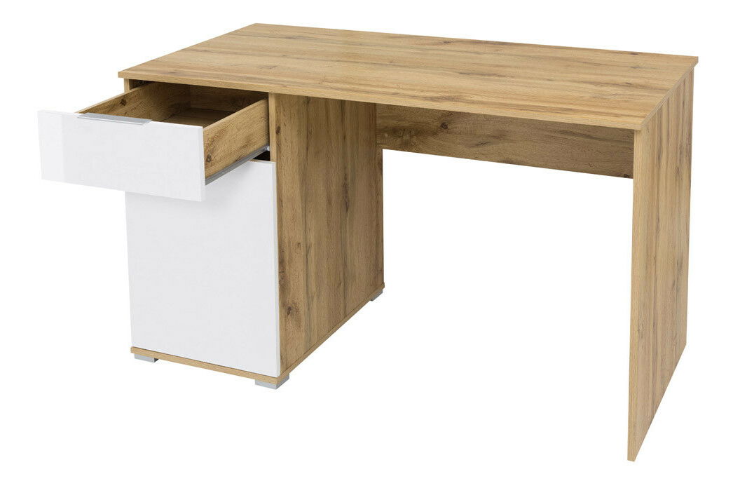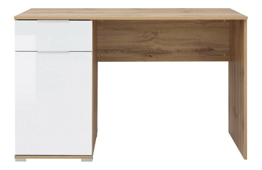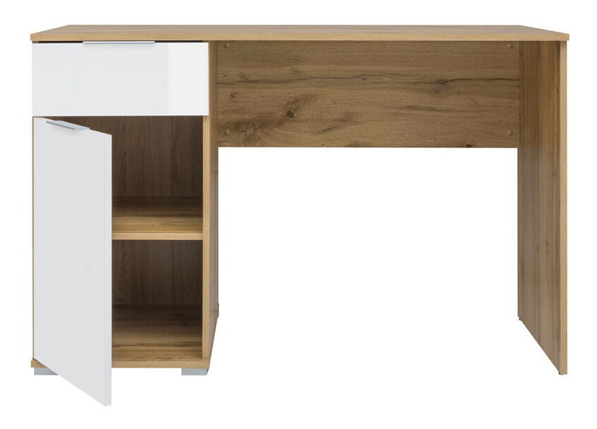 ZobrazitPC stolek minimalistického čistého designu a barevného provedení dubu wotan a lesklé bílé, se kterým vám práce či studium půjdou od ruky. Stolek disponuje skříňkou a šuplíkem v levé části. Za dvířky se nachází prostor rozdělený poličkou na dvě části. Zásuvka a dvířka mají podlouhlé úchyty. Nosnost pracovní desky je 15 kilogramů a vnitřní police 4 kilogramy.