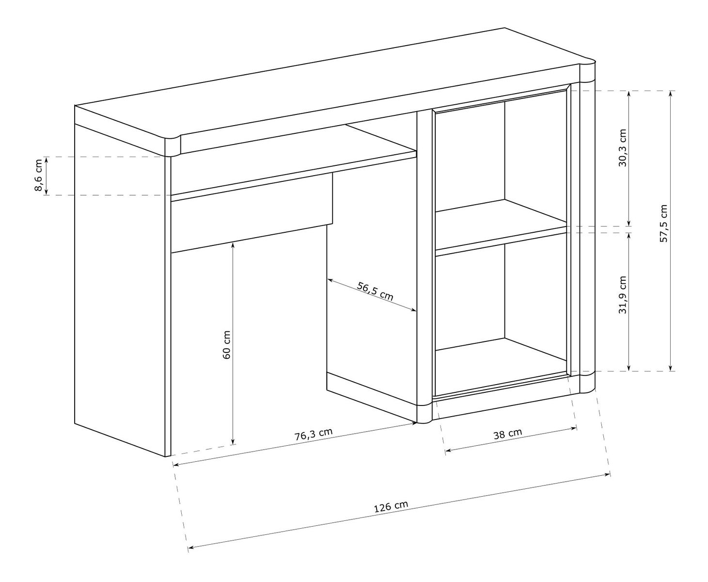 Krásný psací stůl, ideální do dětského pokoje nebo kanceláře. Nábytek vám poskytuje výsuvnou polici na klávesnici počítače a skříňku s knihovnou. Díky tomu bude práce a učení na dálku jednodušší. Psací stůl vám umožňuje uspořádat si věci, dokumenty ve skříňce, přičemž máme spoustu prostoru pro práci a studium. Svým originálním stylem, zdobeným černými ozdobnými lištami a černými úchyty snadno zapadne do jakéhokoli zařízení místnosti. Stabilní konstrukce zaručuje léta úspěšné práce s psacím stolem.