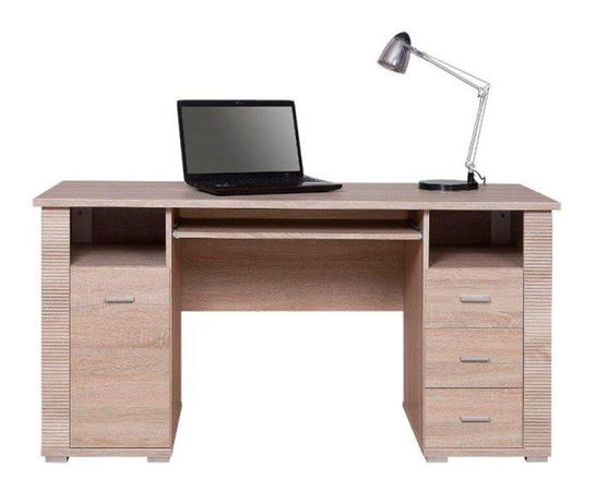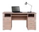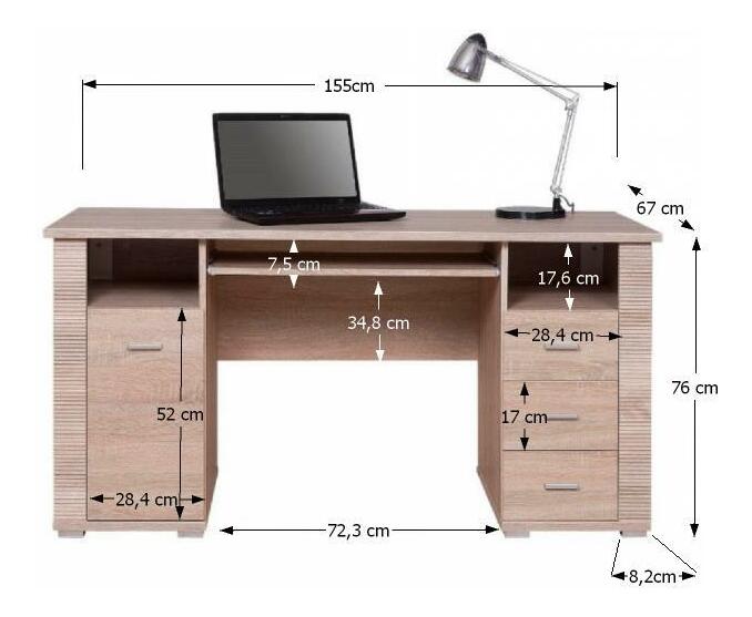 Masivní PC stolek s třemi zásuvkami na pravé straně umiestnemými nad sebou, poličkou nad nimi a jedněmi dvířky a poličkou nad nimi na straně levé. Ve středu je pod horní deskou umístěna vysouvací deska na klávesnici.
