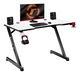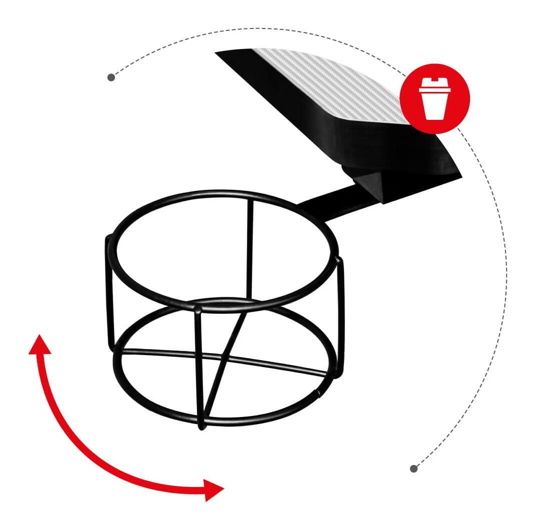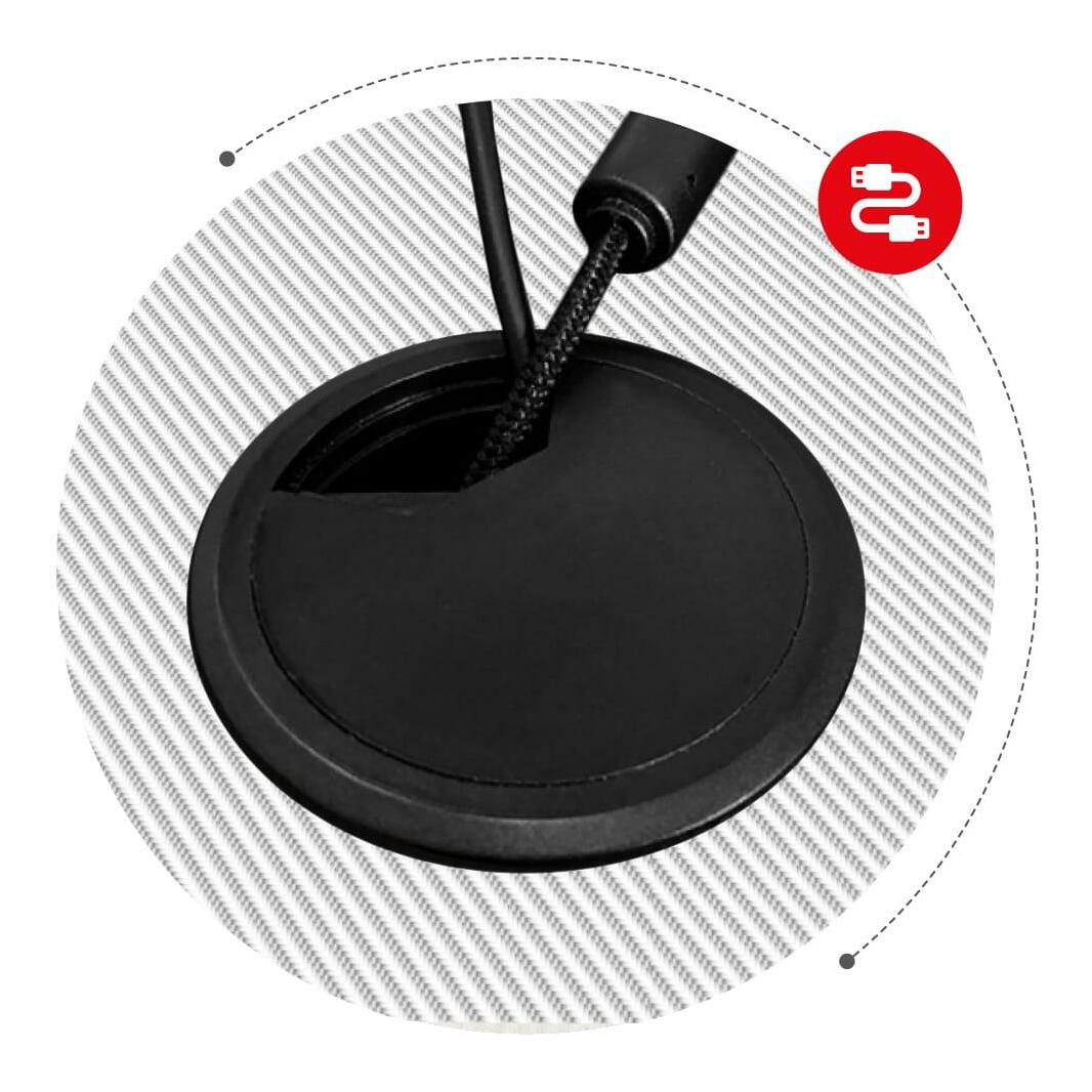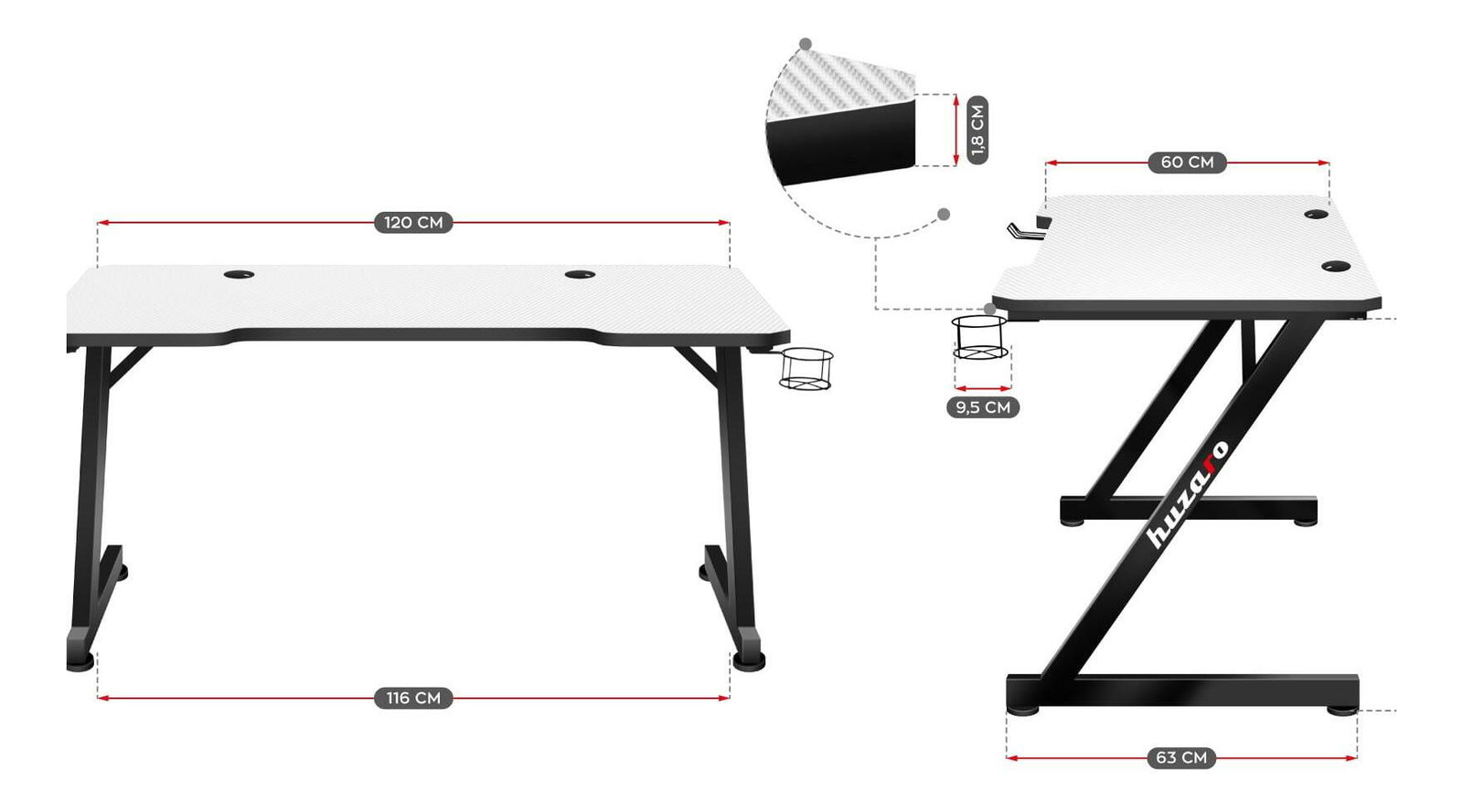 Deska stolu je pokryta speciálním povlakem podobným uhlíku. Jedná se o mimořádně praktické řešení, stolová deska je odolná, odolná vůči poškrábání a nečistotám a zároveň skvěle vypadá. Stolová deska o tloušťce 15 mm vyrobená z odolné MDF desky zajišťuje odolnost a stabilitu i při velmi vysokém tlaku. Stůl má symetricky umístěné kabelové vstupy, takže si každý může celý stůl vyskládat podle sebe. Vstup na levé straně stolu je navíc vybaven třemi USB 2.0 porty pro nabíjení zařízení. Držáky sluchátek a nápojů pomáhají udržovat pořádek na pracovní stanici a zvyšují bezpečnost zařízení.