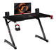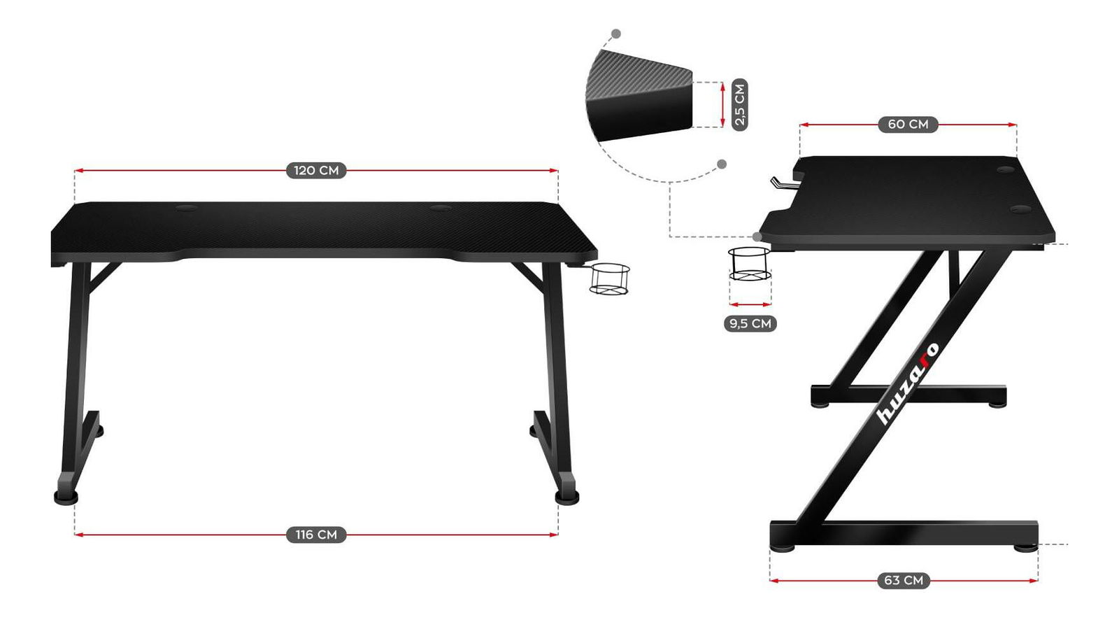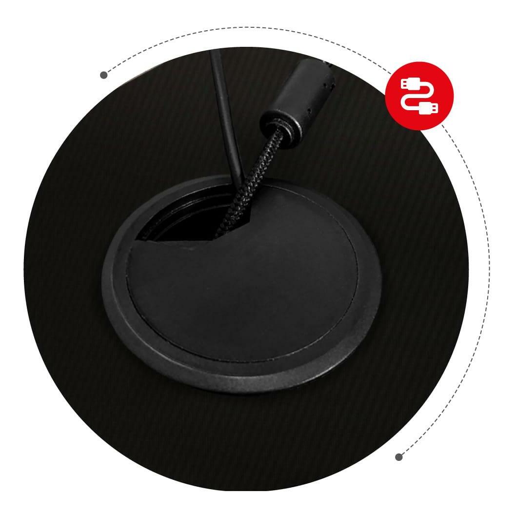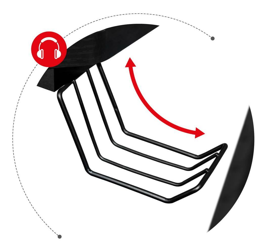 Deska stolu je pokryta speciálním povlakem podobným uhlíku. Jedná se o mimořádně praktické řešení, stolová deska je odolná, odolná vůči poškrábání a nečistotám a zároveň skvěle vypadá. Stolová deska o tloušťce 15 mm vyrobená z odolné MDF desky zajišťuje odolnost a stabilitu i při velmi vysokém tlaku. Stůl má symetricky umístěné kabelové vstupy, takže si každý může celý stůl vyskládat podle sebe. Vstup na levé straně stolu je navíc vybaven třemi USB 2.0 porty pro nabíjení zařízení. Držáky sluchátek a nápojů pomáhají udržovat pořádek na pracovní stanici a zvyšují bezpečnost zařízení.