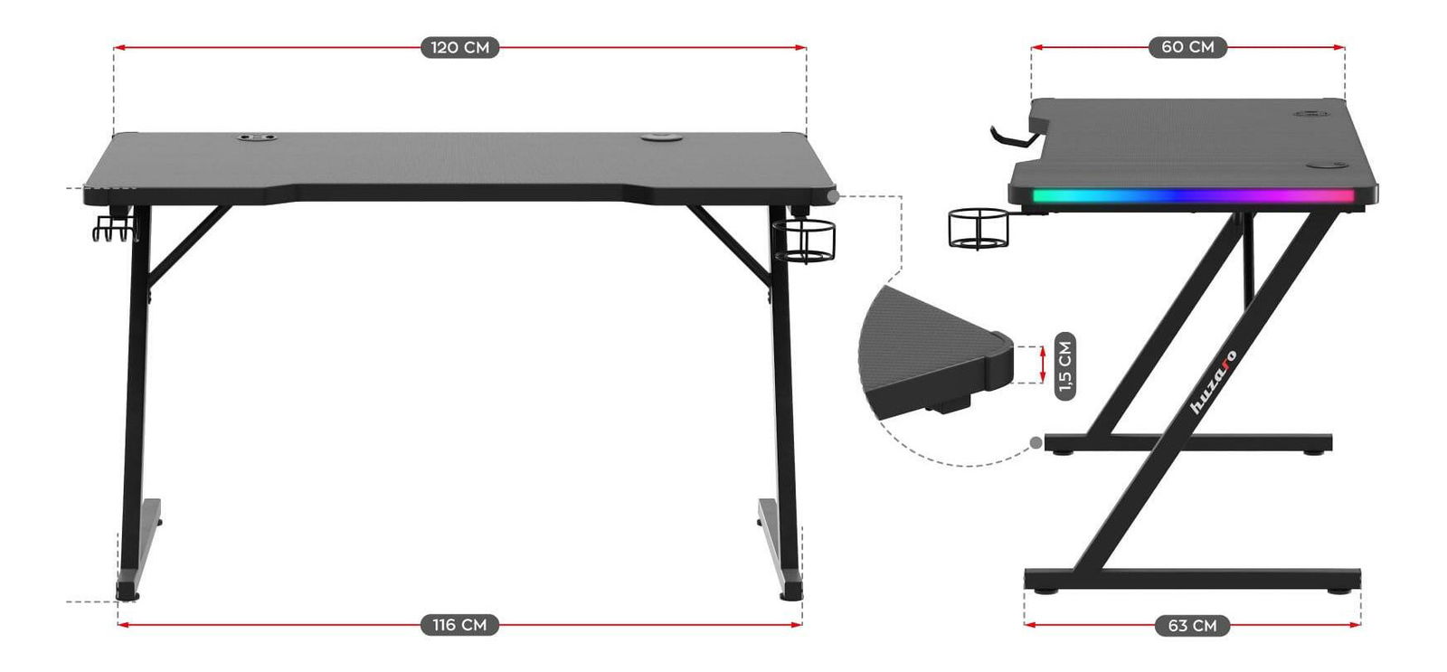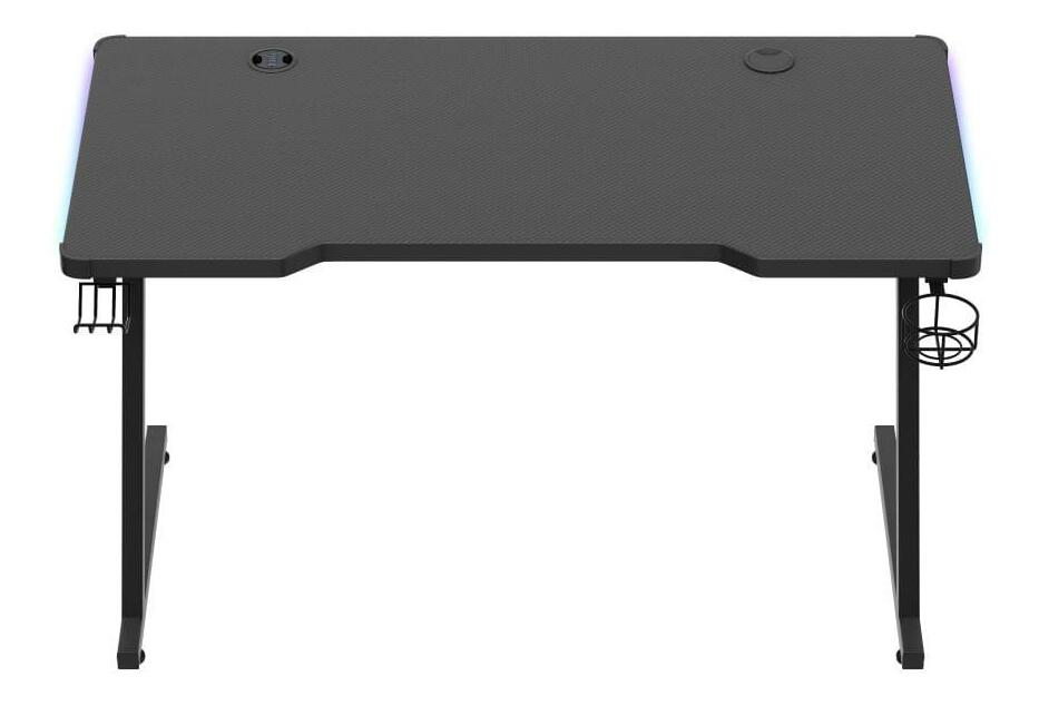 Herní design, dotvořený materiálem imitujícím uhlíková vlákna a RGB LED osvětlením. To je stolek Hyperion. RGB LED pásky umístěné na okrajích stolové desky dodávají stolu úžasný herní charakter. Stůl umístěný blízko stěny nebo nábytku vytvoří jedinečnou atmosféru, neboť světlo se bude odrážet od okolních předmětů. Osvětlení je ovládáno pohodlným dálkovým ovladačem, který umožňuje výběr barev a speciálních RGB efektů. Osvětlení můžete také kdykoli vypnout, pokud jej nechcete používat. Deska stolu je pokryta speciálním povlakem podobným uhlíku. Jedná se o mimořádně praktické řešení, stolová deska je odolná, odolná vůči poškrábání a nečistotám a zároveň skvěle vypadá. Stolová deska o tloušťce 15 mm vyrobená z odolné MDF desky zajišťuje odolnost a stabilitu i při velmi vysokém tlaku. Stůl má symetricky umístěné kabelové vstupy, takže si každý může celý stůl vyskládat podle sebe. Vstup na levé straně stolu je navíc vybaven třemi USB 2.0 porty pro nabíjení zařízení. Držáky sluchátek a nápojů pomáhají udržovat pořádek na pracovní stanici a zvyšují bezpečnost zařízení.