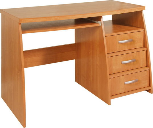 Elegantní PC stůl s dostatkem úložného prostoru. Skládá se z pracovní desky, pod kterou se na levé straně stolu nachází výsuvná deska na klávesnici. Na pravé straně stolku je pod horní deskou umístěná polička a pod ní se nacházejí 3 zásuvky, které zajímavým rostoucím způsobem vystupují po jednom do prostoru. Oblé šedé úchyty na zásuvkách.