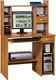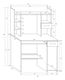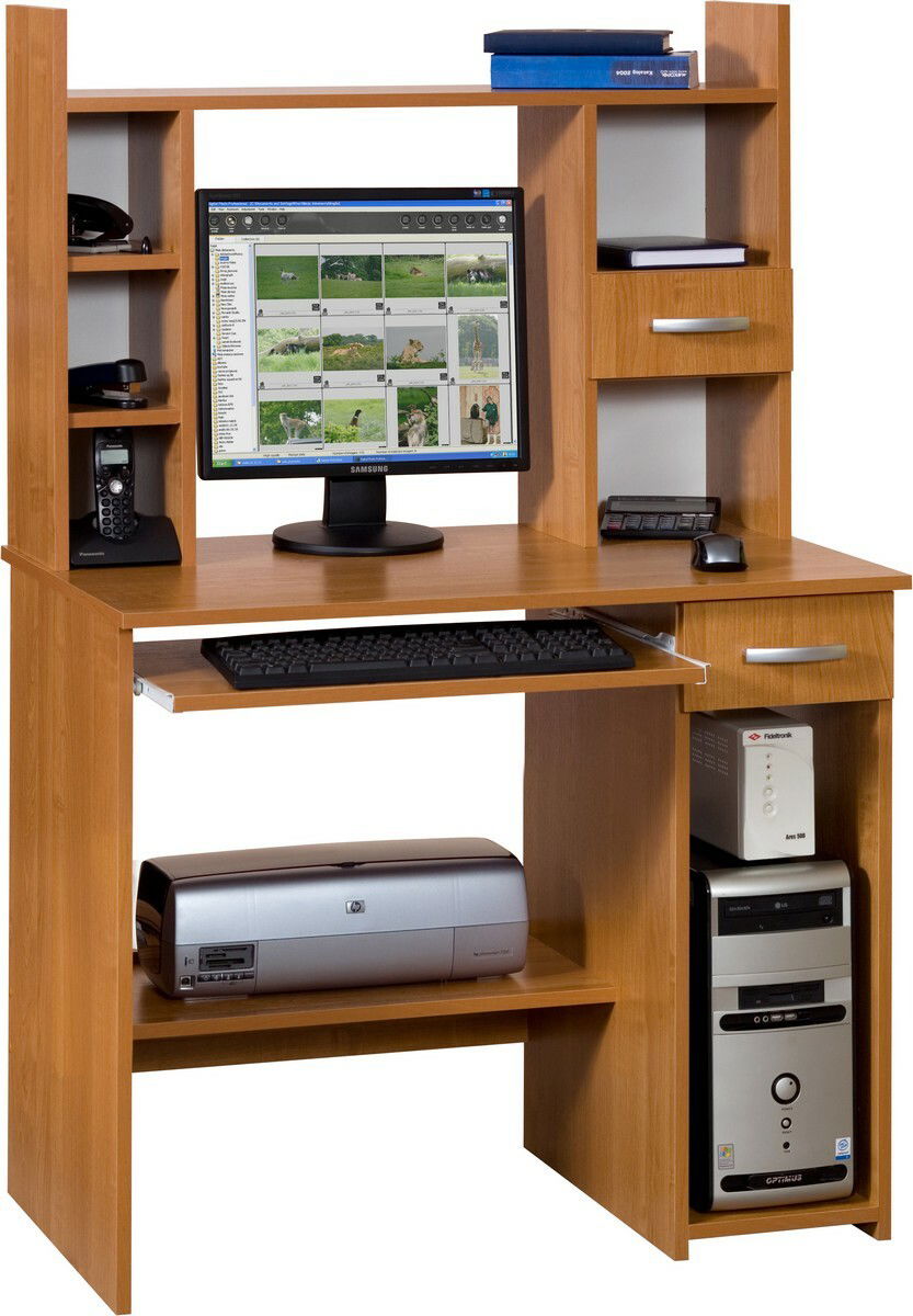Elegantní PC stůl s dostatkem úložného prostoru. Skládá se z pracovní desky, pod kterou se na levé straně stolu nachází výsuvná deska na klávesnici. Na pravé straně stolku je pod horní deskou umístěna zásuvka, pod ní se nachází otevřená polička na klasickou skříň pro počítač. V prostoru pro nohy je na levé straně umístěna polička na tiskárnu. Na horní pracovní desce se nachází nástavba, která se skládá z 3 poliček na levé straně, 2 poliček na pravé straně a jedné zásuvky mezi nimi. Oblé šedé úchyty na zásuvkách,