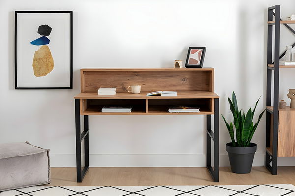 PC stolek - Kemno je ideálním doplňkem pro vaši domácí kancelář. S výškou 95,8 cm, šířkou 120 cm a hloubkou 55 cm poskytuje dostatek prostoru pro váš počítač a ostatní pracovní potřeby. Vyrobeno z kvalitní 100% melaminové desky, stolek je odolný vůči poškrábání a snadno se udržuje. Jeho elegantní design v ořechovém a černém provedení přiláká pozornost každého. PC stolek - Kemno je skvělou volbou pro ty, kteří hledají spolehlivý a stylový stolek pro svoji pracovní stanici.