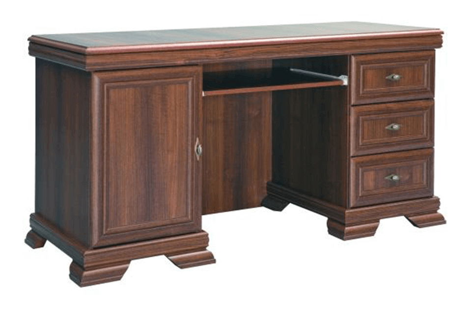 Elegantní rustikální PC stolek, který se bude vyjímat ve vaší pracovně. Má skříňku na levé straně a zásuvky na pravé straně. Uprostřed se nachází výsuvná deska na klávesnici. Má pěkné ozdobné vyřezávané nohy a lišty. Je v krásném tmavém provedení Samoa king.