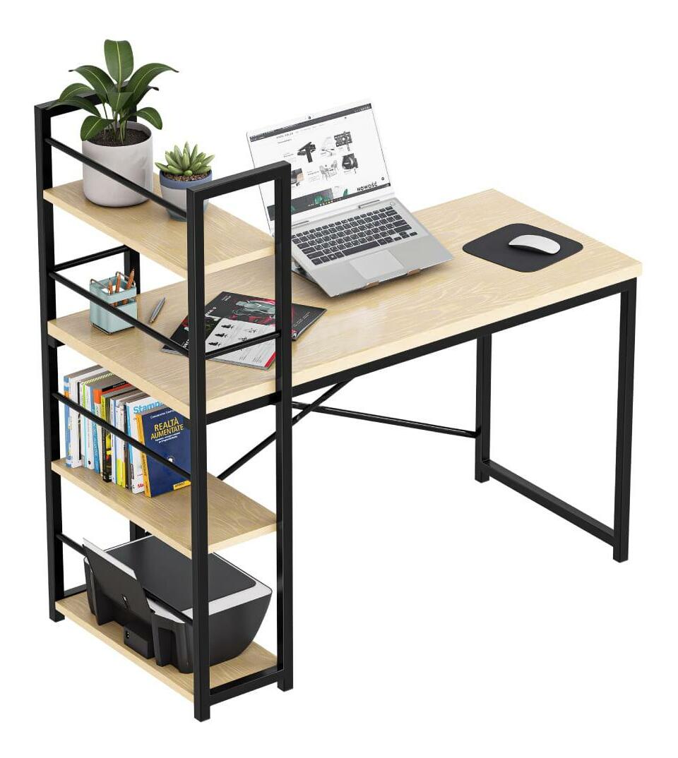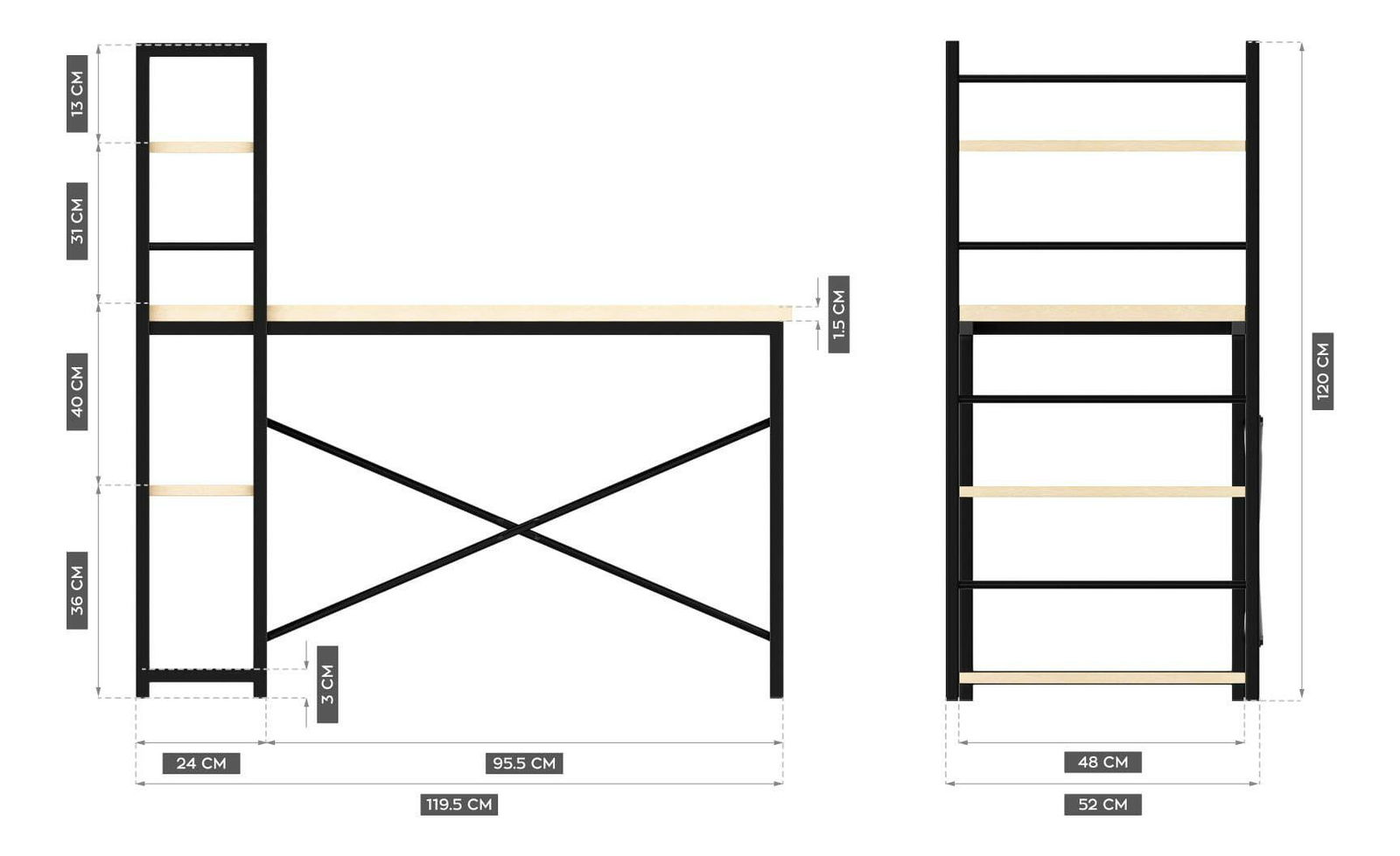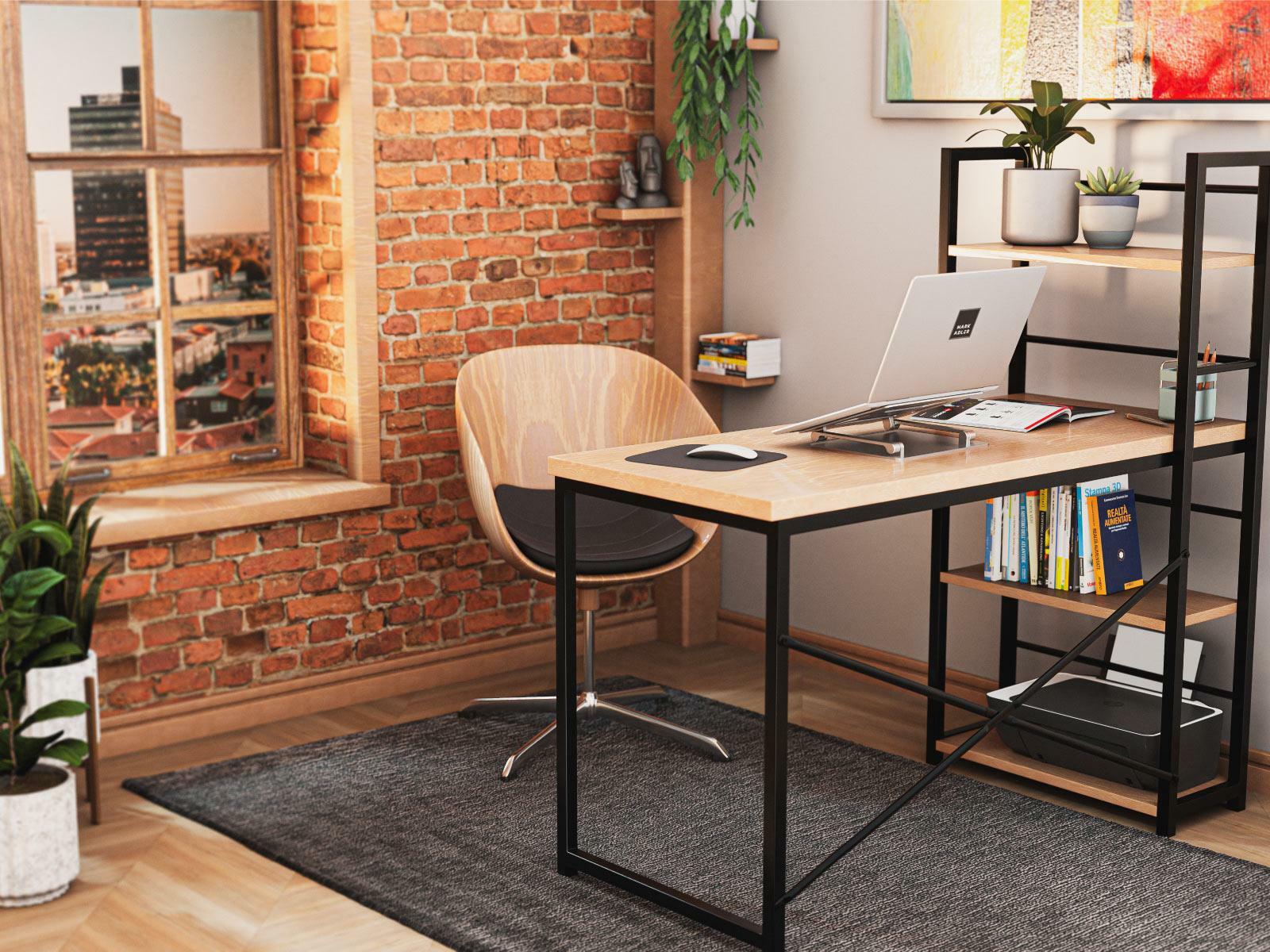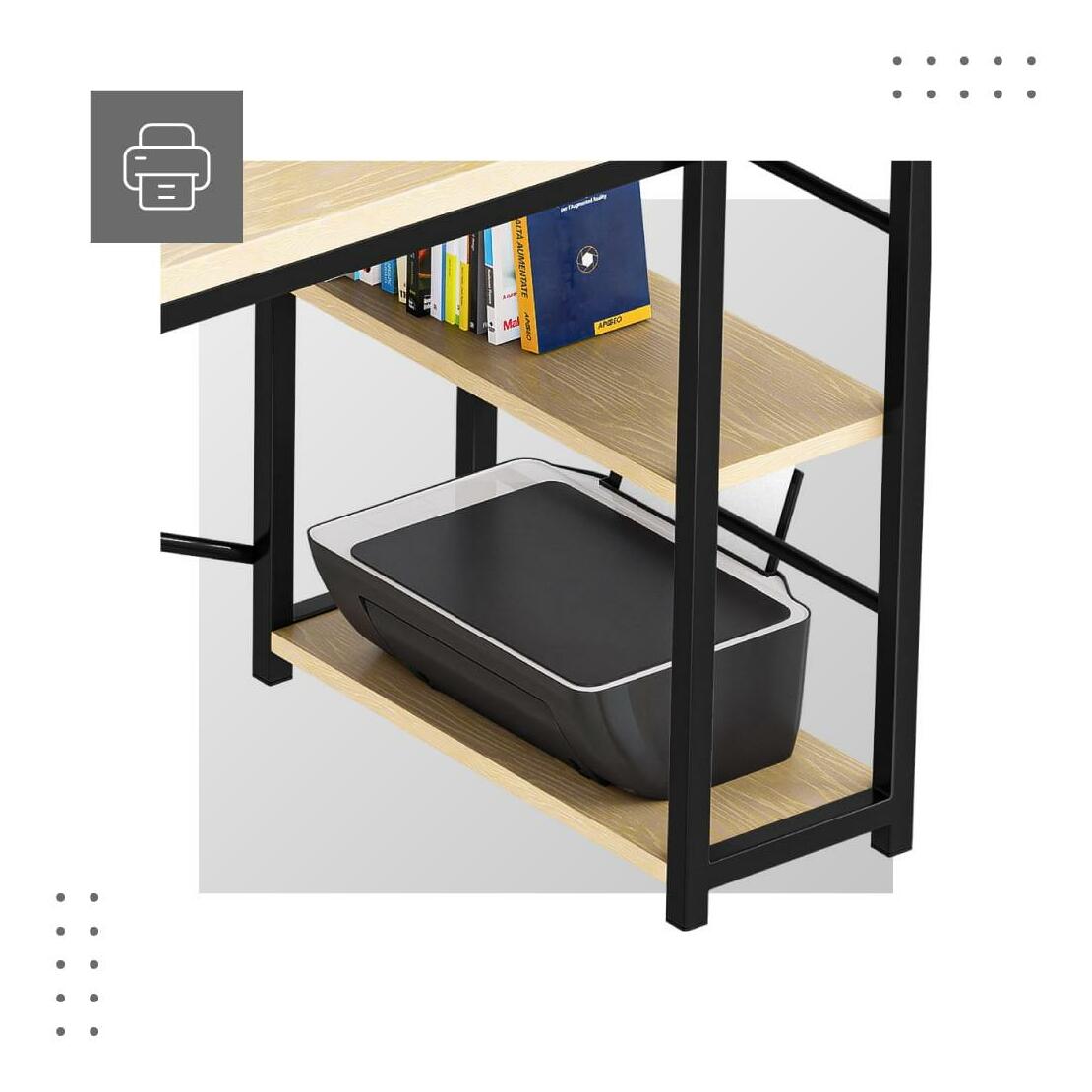 Stolová deska s povrchem ve vzhledu dřeva a rám s práškovým nástřikem vytváří zajímavý efekt, který vypadá skvěle v každé kanceláři nebo studiu. Psací stůl s policí se hodí zejména do industriálních, vintage a loft interiérů. Design stolu umožňuje jeho montáž na pravou i levou stranu. Díky tomu si bez ohledu na prostor, který máte, snadno přizpůsobíte nábytek svému uspořádání. Pracovní deska s nátěrem imitujícím přírodní dřevo je odolná vůči poškození a snadno se udržuje a čistí. Elegantní a pevný rám zaručuje stabilitu a odolnost. Rám s práškovým nástřikem je odolný vůči poškrábání, poškození a UV záření. Křížově uspořádané podpěry zvyšují stabilitu stolu a zajišťují pohodlí při práci. Maximální zatížení desky stolu je až 70 kg. Na každou polici můžete umístit až 15 kg.